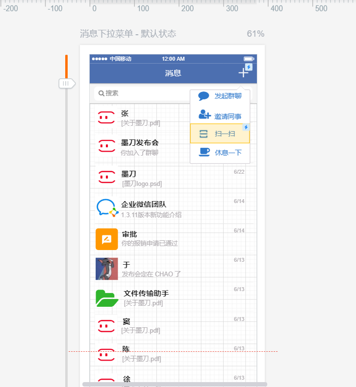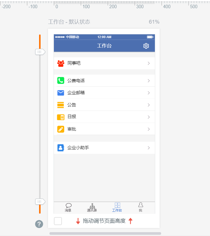 企业微信是腾讯集团旗下的一款办公沟通工具,在微信的基础上集成了公费电话和邮件功能,以及公告、考勤、请假、报销等功能都可在其中实现。作为一款代表性的企业服务类社交app模板,企业微信可以分为“消息”、“通讯录”、“我”三大板块。对比上文,你会发现,它的“工作台”页面和钉钉的“工作”页面的区别。企业微信也提供了极具复用价值的“消息”页面、“消息下拉菜单”页面、“通讯录”页面、“工作台”页面,它们在设计原型中可以用到。