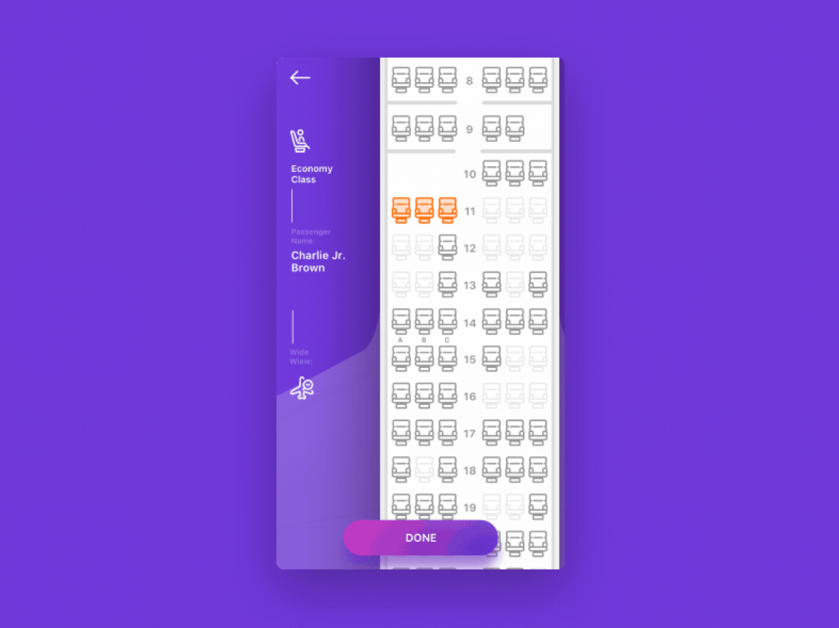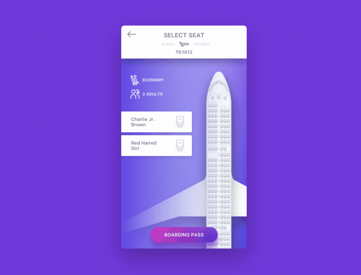 ▲航空公司的选座设计,作者很好的将飞机运用晶白设计手法,让飞机整体有一定厚重感,然后将选座的操作行动点融于其中。