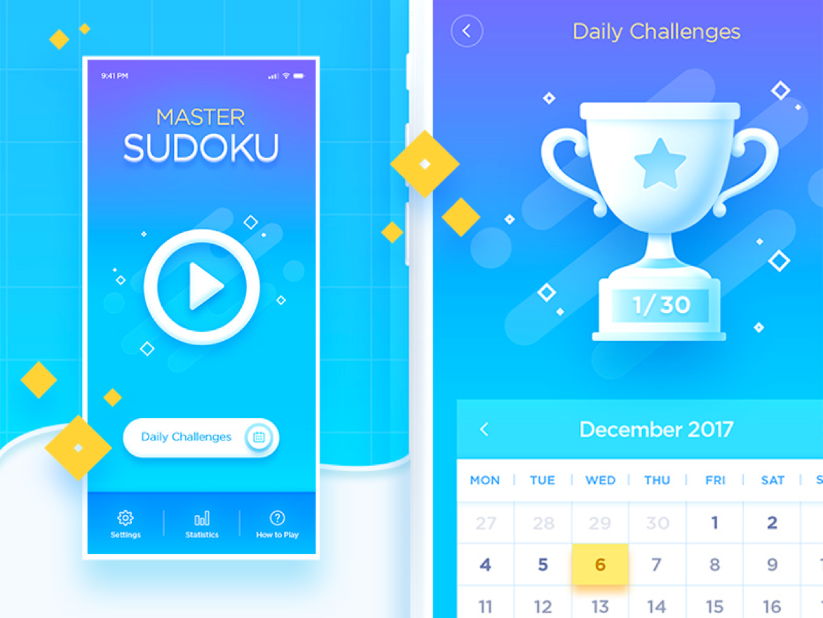 ▲这个数独游戏设计中,页面主图形就是运用晶白作为主图形风格,整体颜色清爽,细节丰富,其实白色透明几何图形作为背景,主图形,运用白色和环境色融合处理,整体呈现高级感。