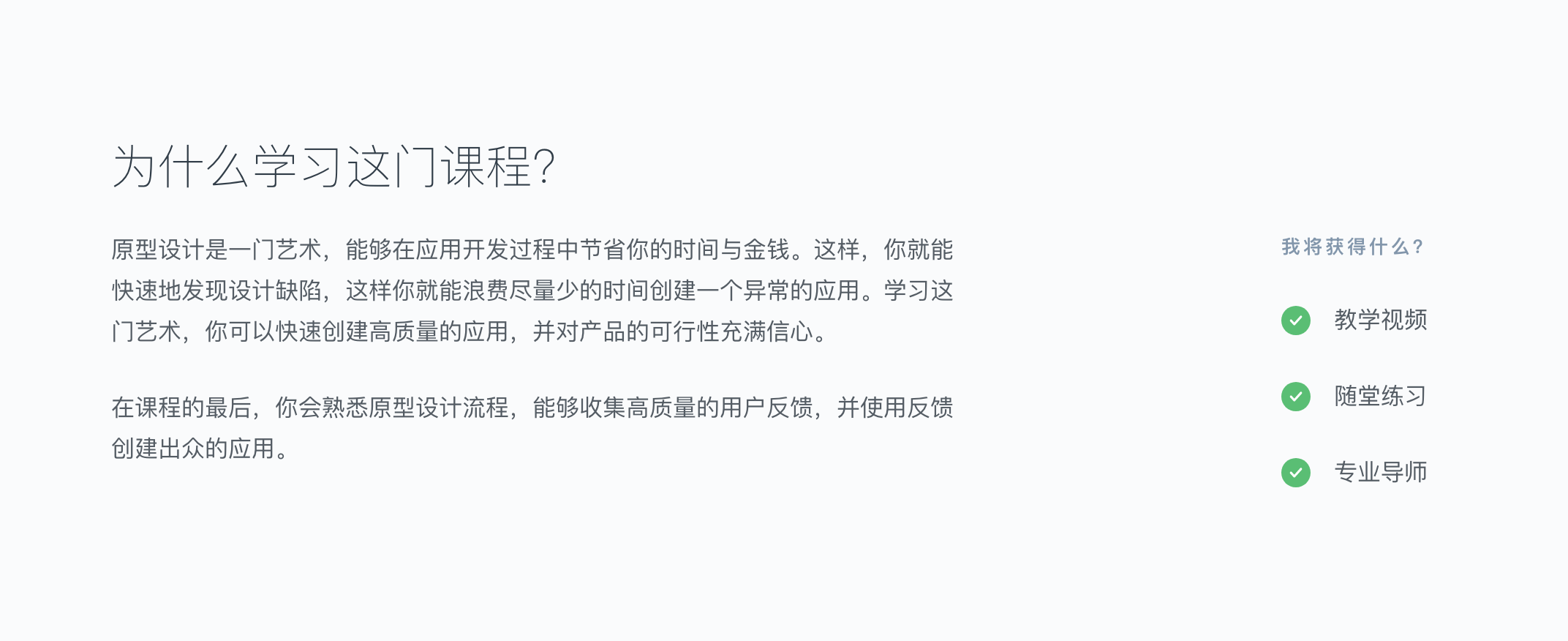 正如其名,这门课程围绕如何快速创建原型这一主题,分为低保真原型、中保真原型和高保真原型三个模块,带领你学习原型设计的迭代过程以及如何进行用户研究。
