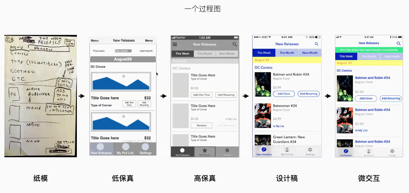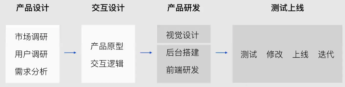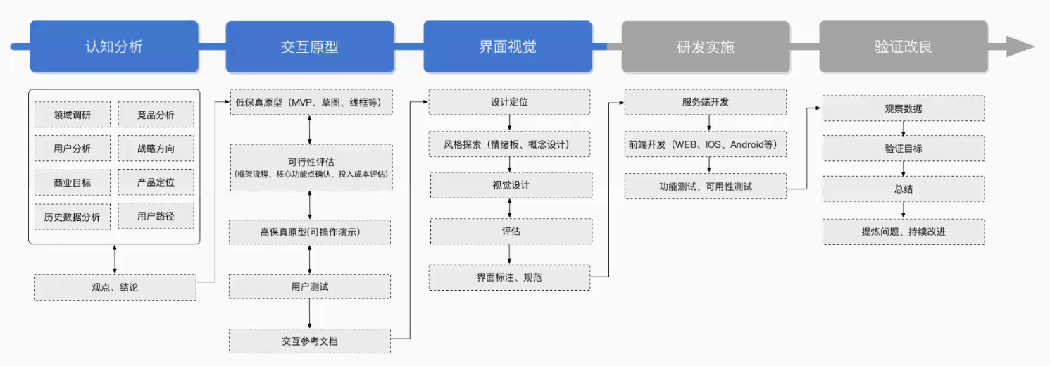 产品设计流程:认知分析 → 交互原型 → 界面视觉 → 研发实施 → 验证改良