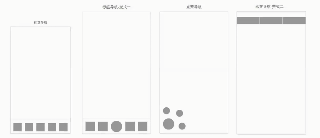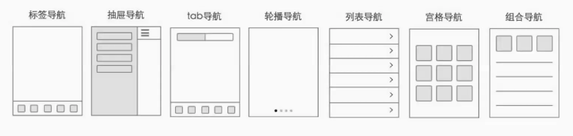 标签导航、抽屉导航、tab导航、轮播导航、列表导航、宫格导航、组合导航