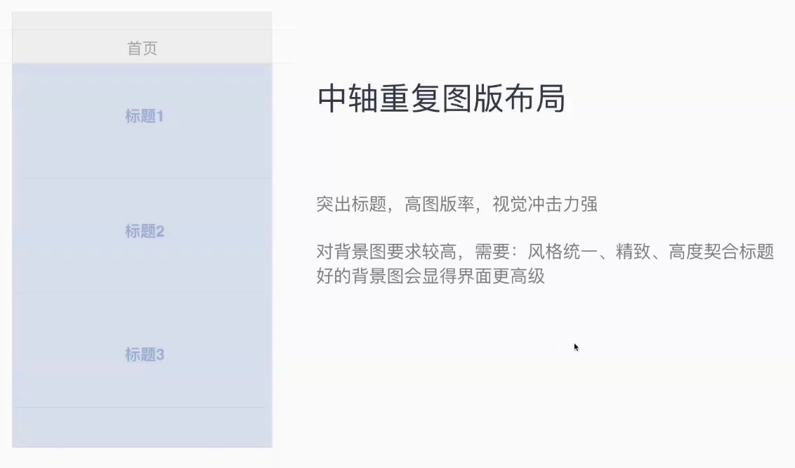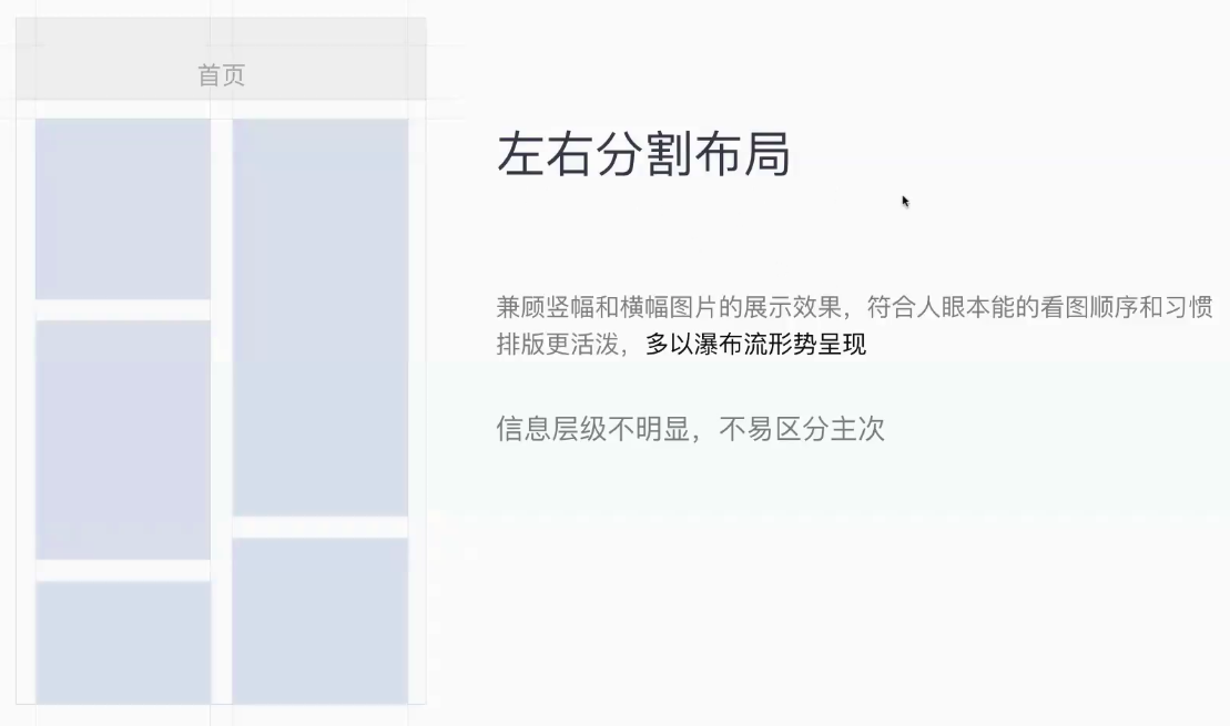 内容展示:竖向分栏、上下分割、中轴重复图版、左右分割
