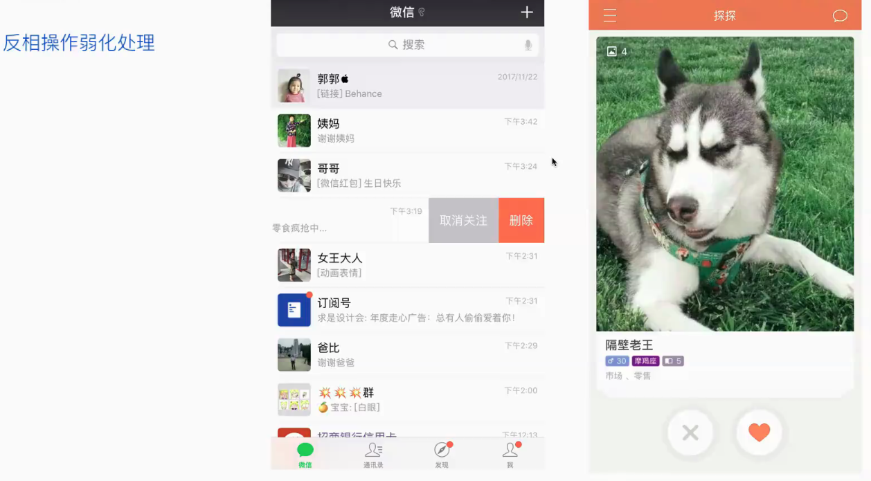 优点:突出内容,弱化操作,节省空间,适用于辅助功能的信息流产品,或次要功能导航。