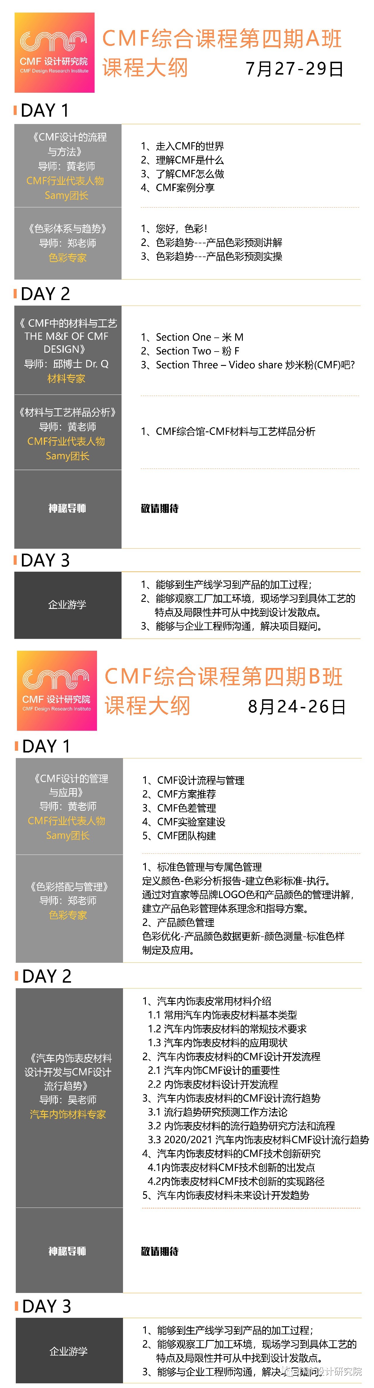 CMF作为企业深入研发实力与前瞻服务能力的重要特征,目前正处于蓬勃发展的时代,个人、企业、高等院校,都在积极关注CMF的学习、应用与教育。想要学习CMF技能,将CMF融入到企业的产品与流程,开设CMF课程,可关注由CMF设计研究院举办的CMF设计研修班,包含CMF基础课程及CMF进阶课程,详情如下: