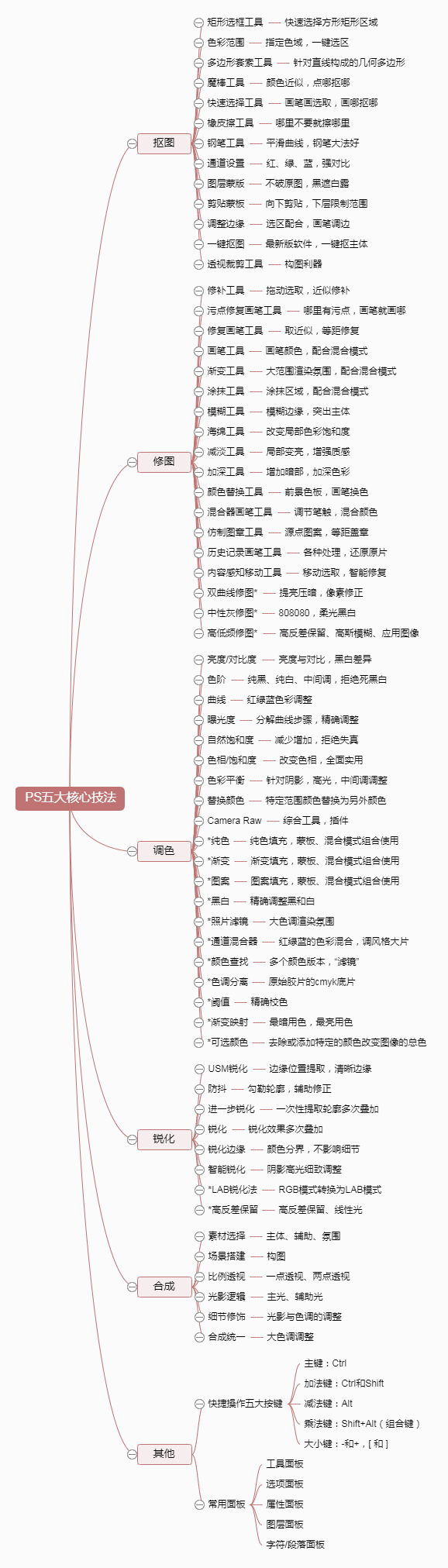 利用思维导图搭建知识体系,是快速理解和学习知识的方法之一,在技能学习上更容易理清整体思路。我们接下来通过对Photoshop软件的知识梳理,搭建自学Photoshop软件所需要的知识体系。