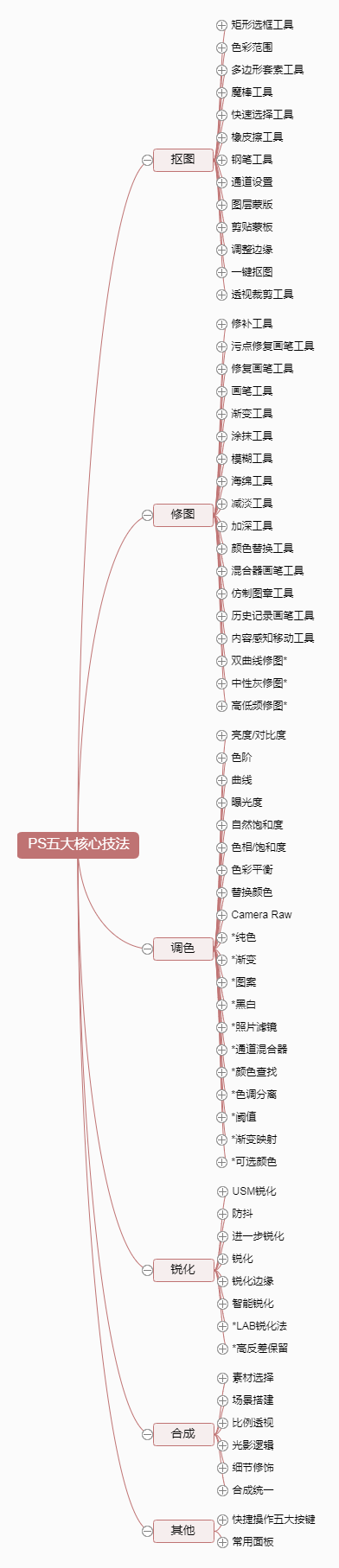 (软件主要是工具的使用,因此在层级思路上,我们可以直接使用工具名称和常见方法作为我们的关键词。不经常使用或组合使用的工具和方法,我们用“ * ”号表示,作为本文知识的延伸。)