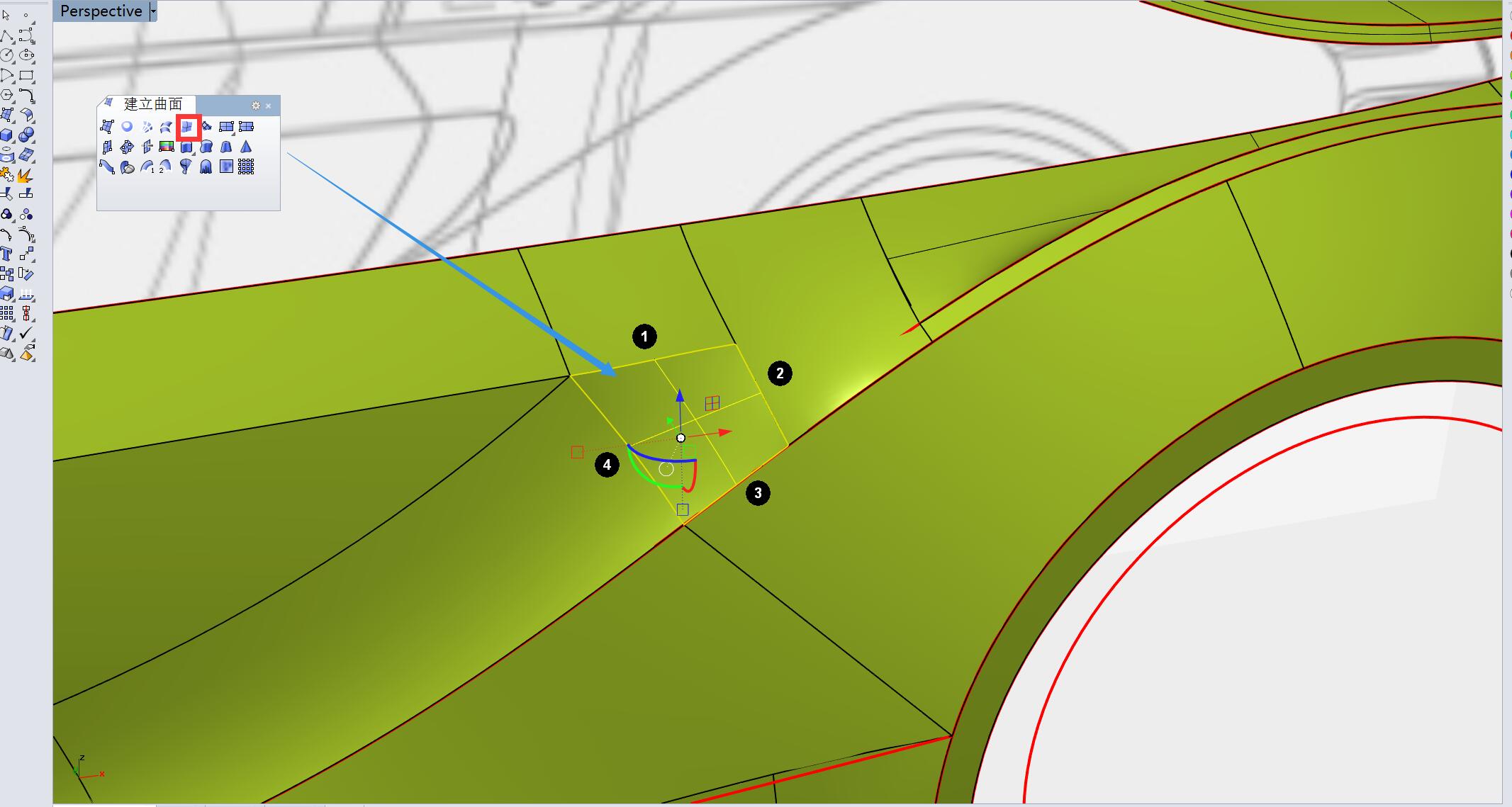 4边成面工具生成如下曲面。并逐一将4个边缘进行衔接,