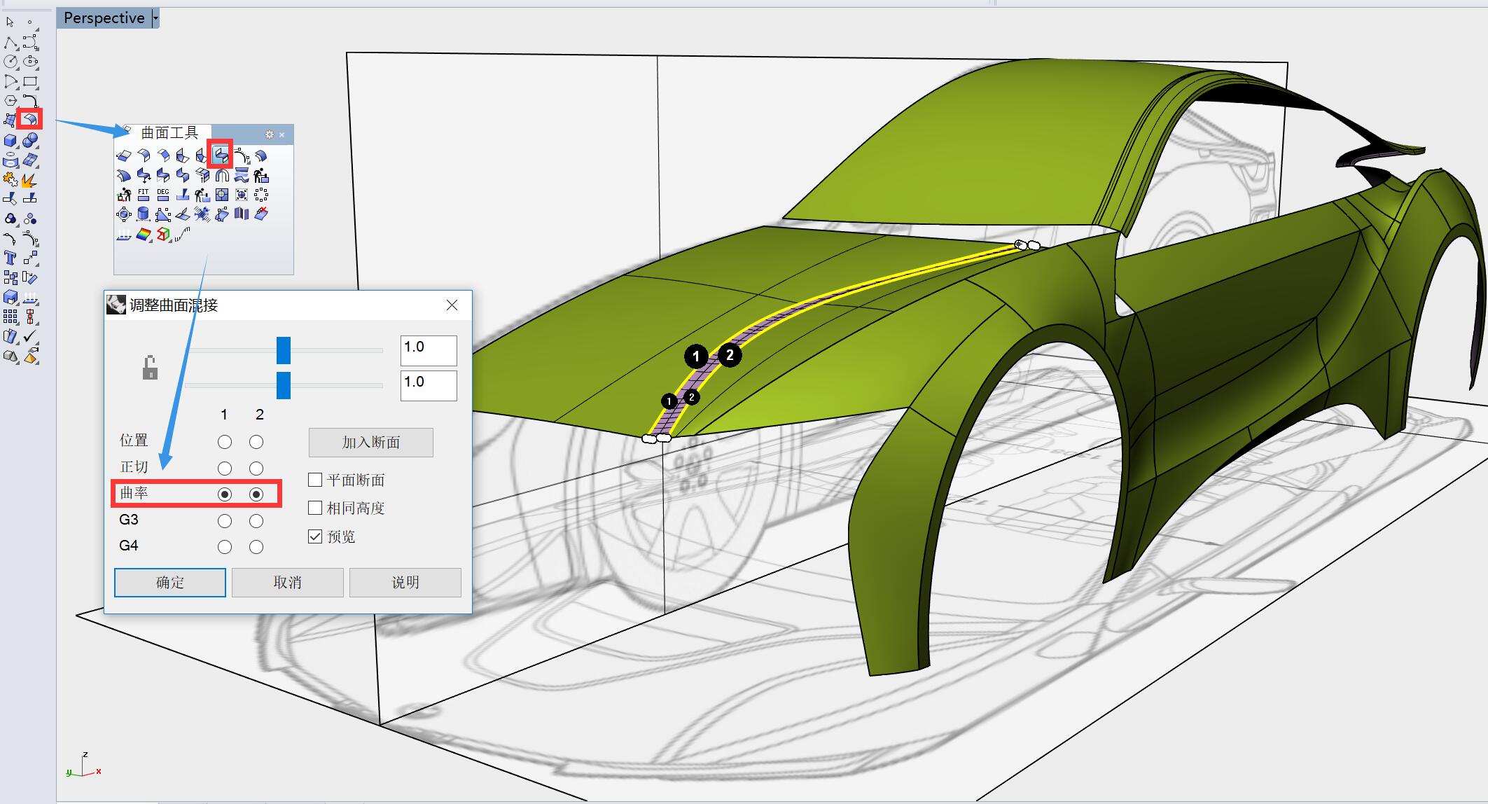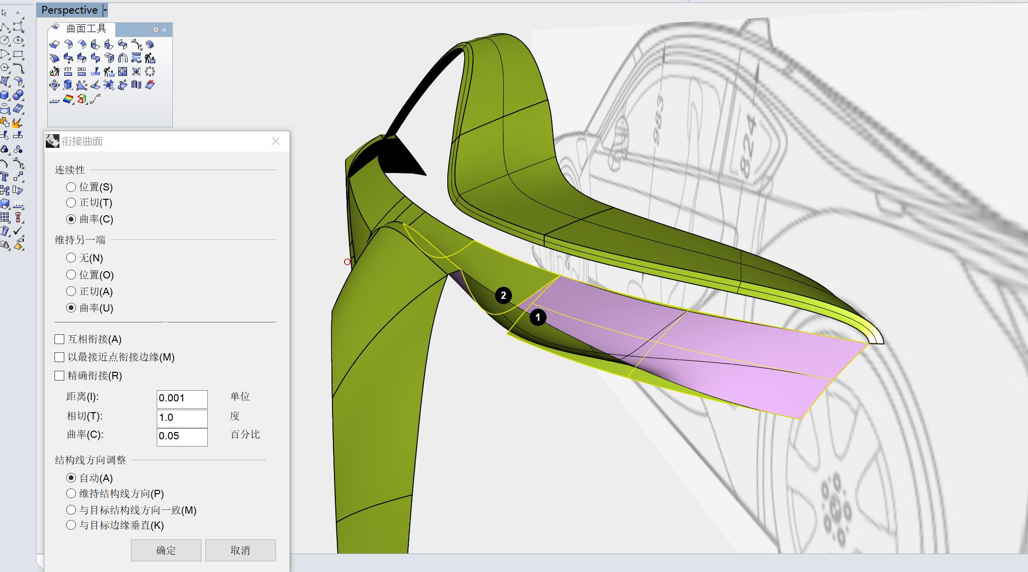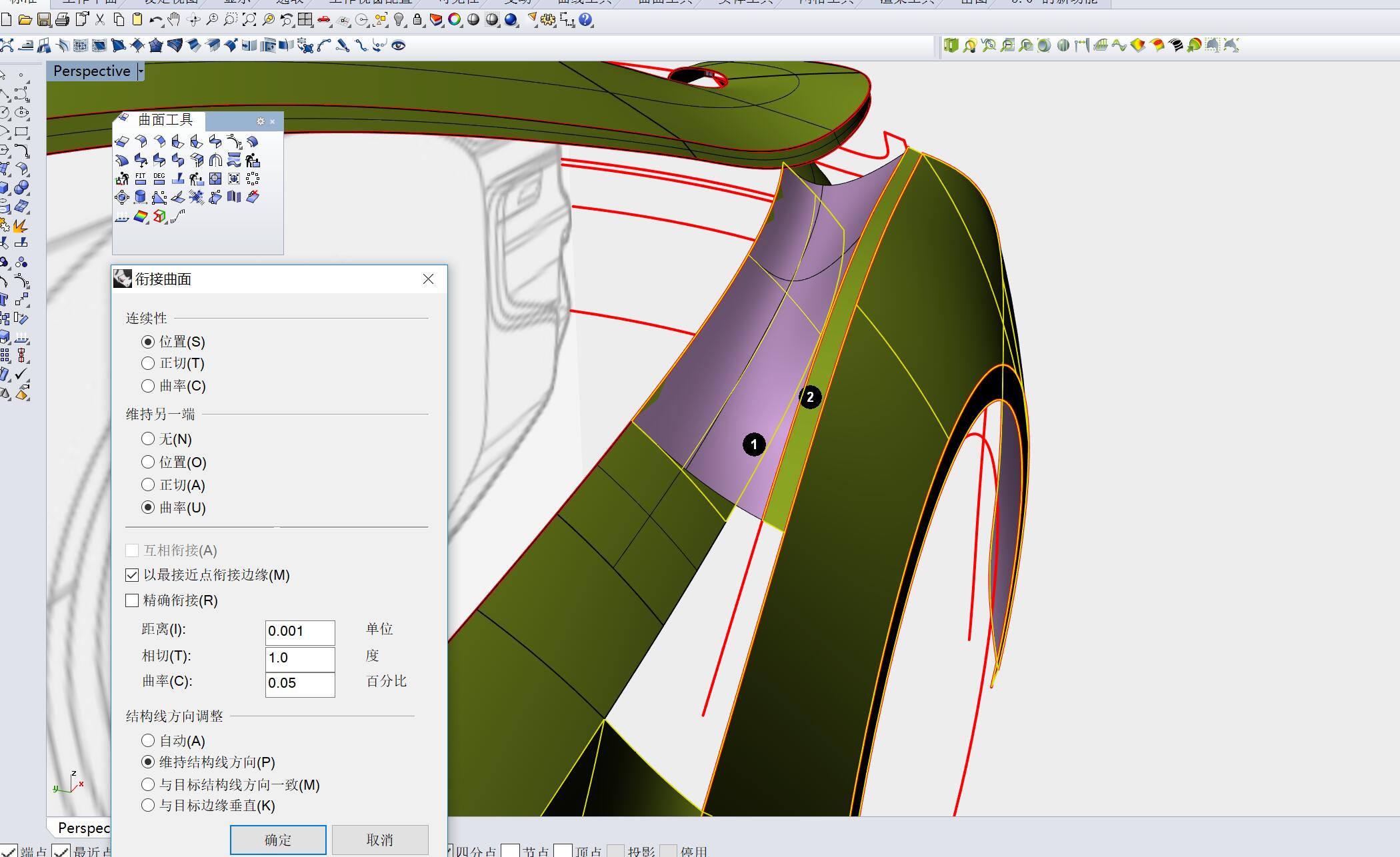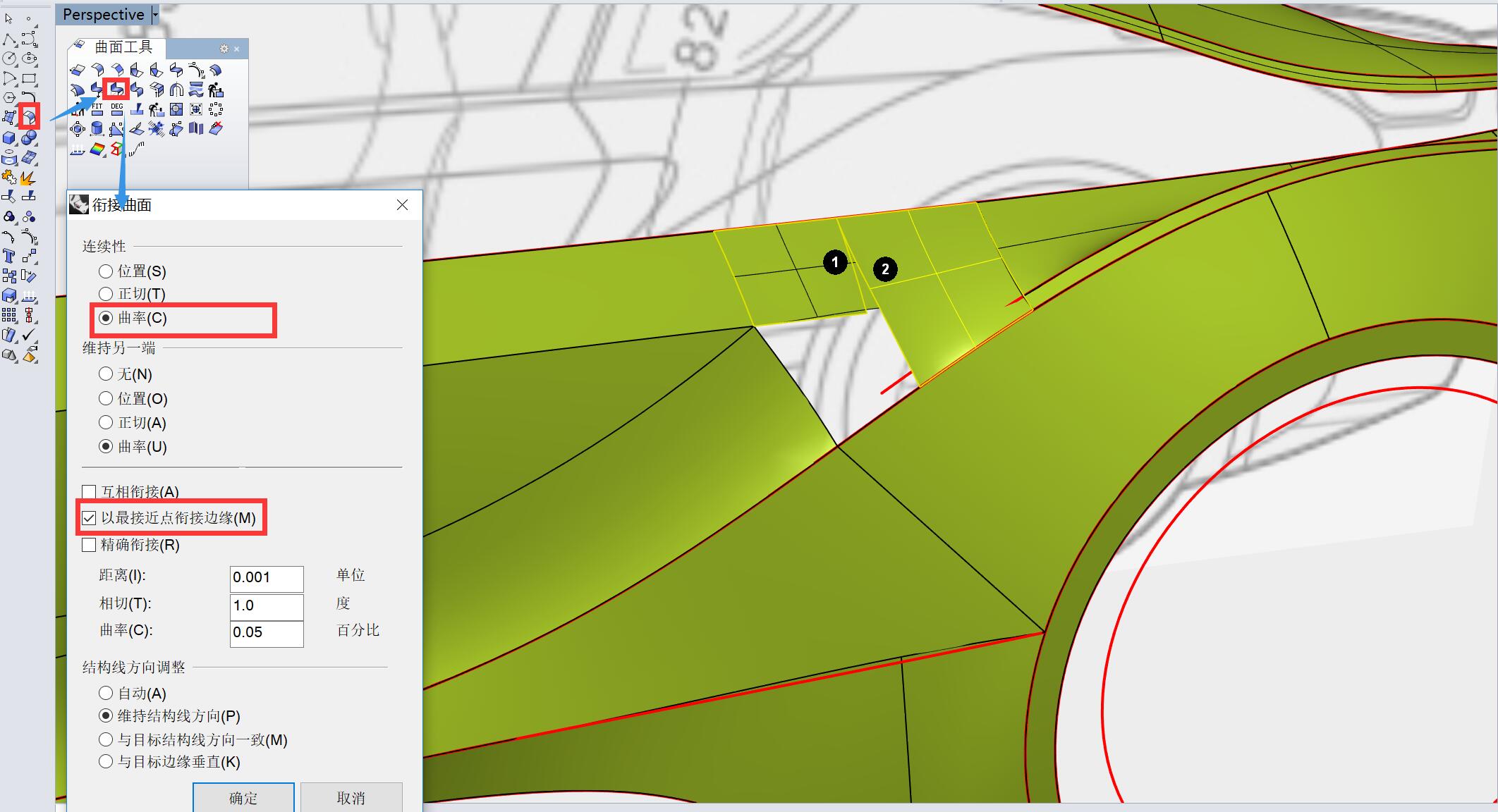 用曲面衔接工具,曲面1边衔接至曲面2边,参数为曲率连续,