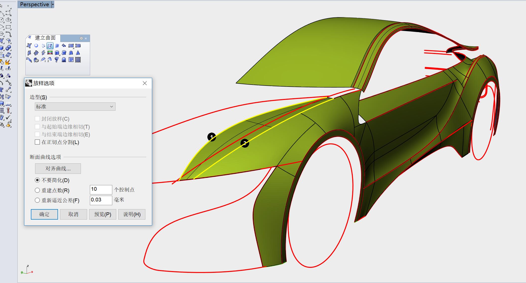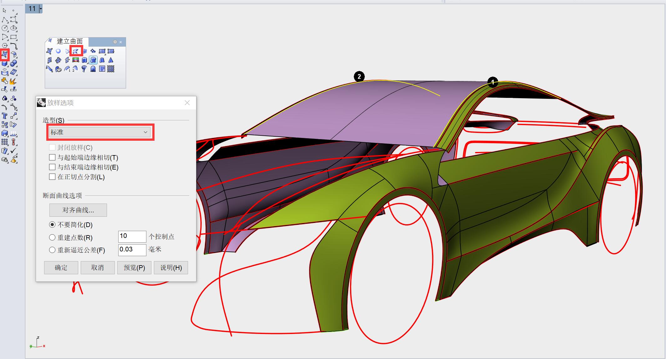 以1、2曲线放样生成如下曲面,并通过控制点调整造型。