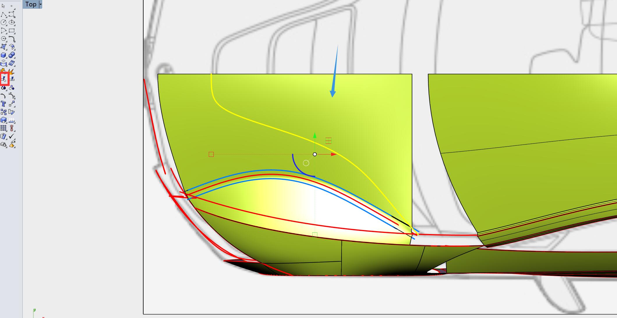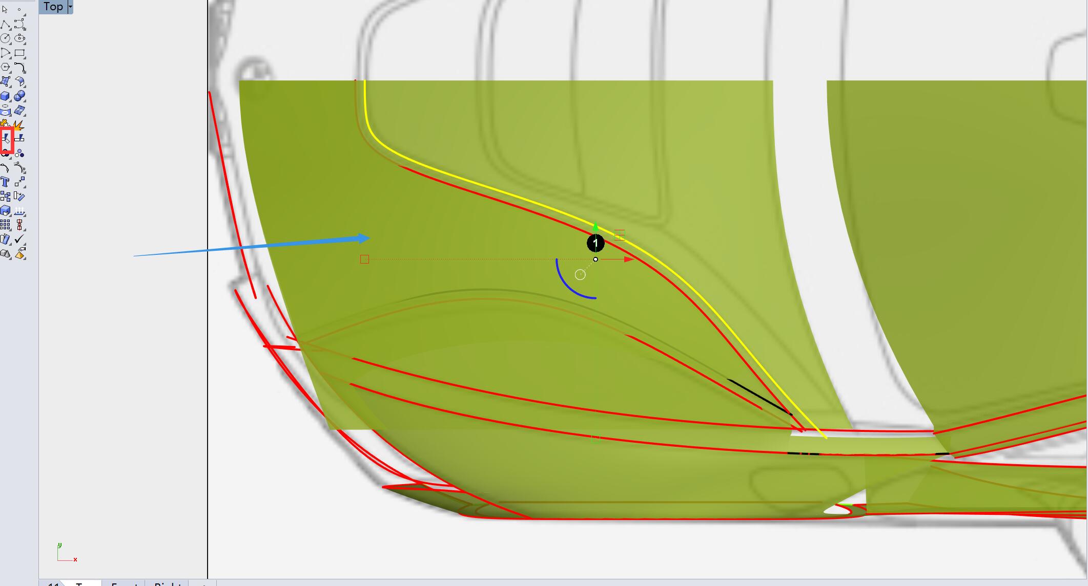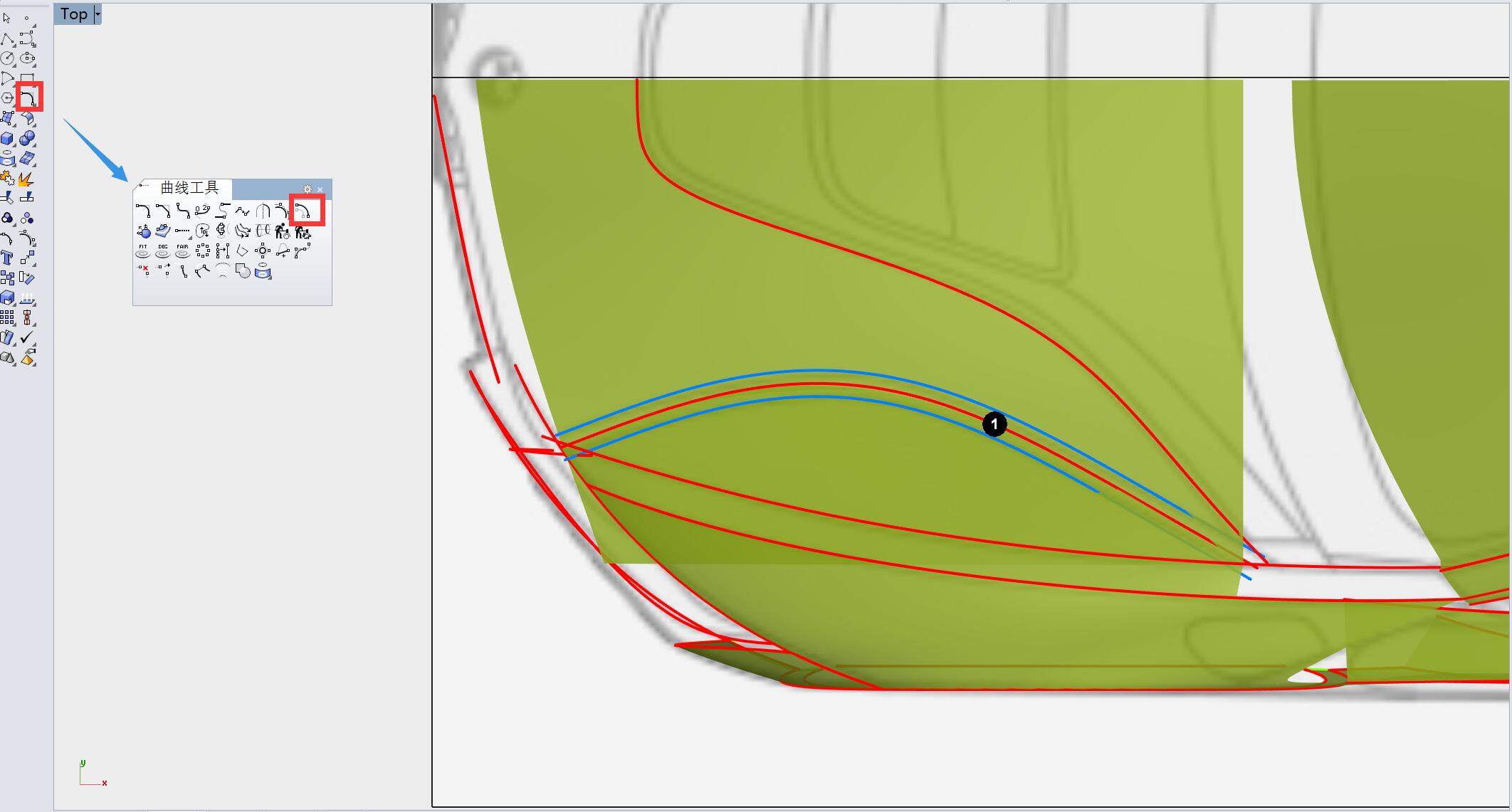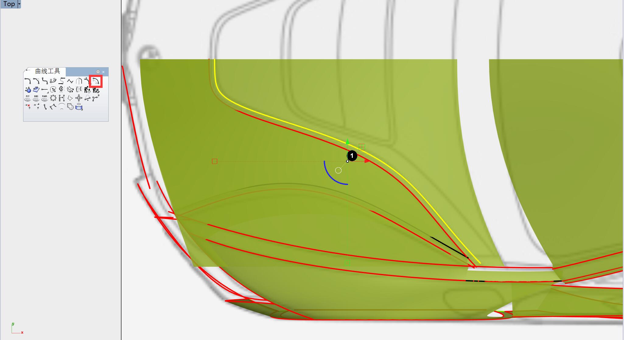 切换至顶视图,用曲线对曲面箭头指示部分进行修剪。