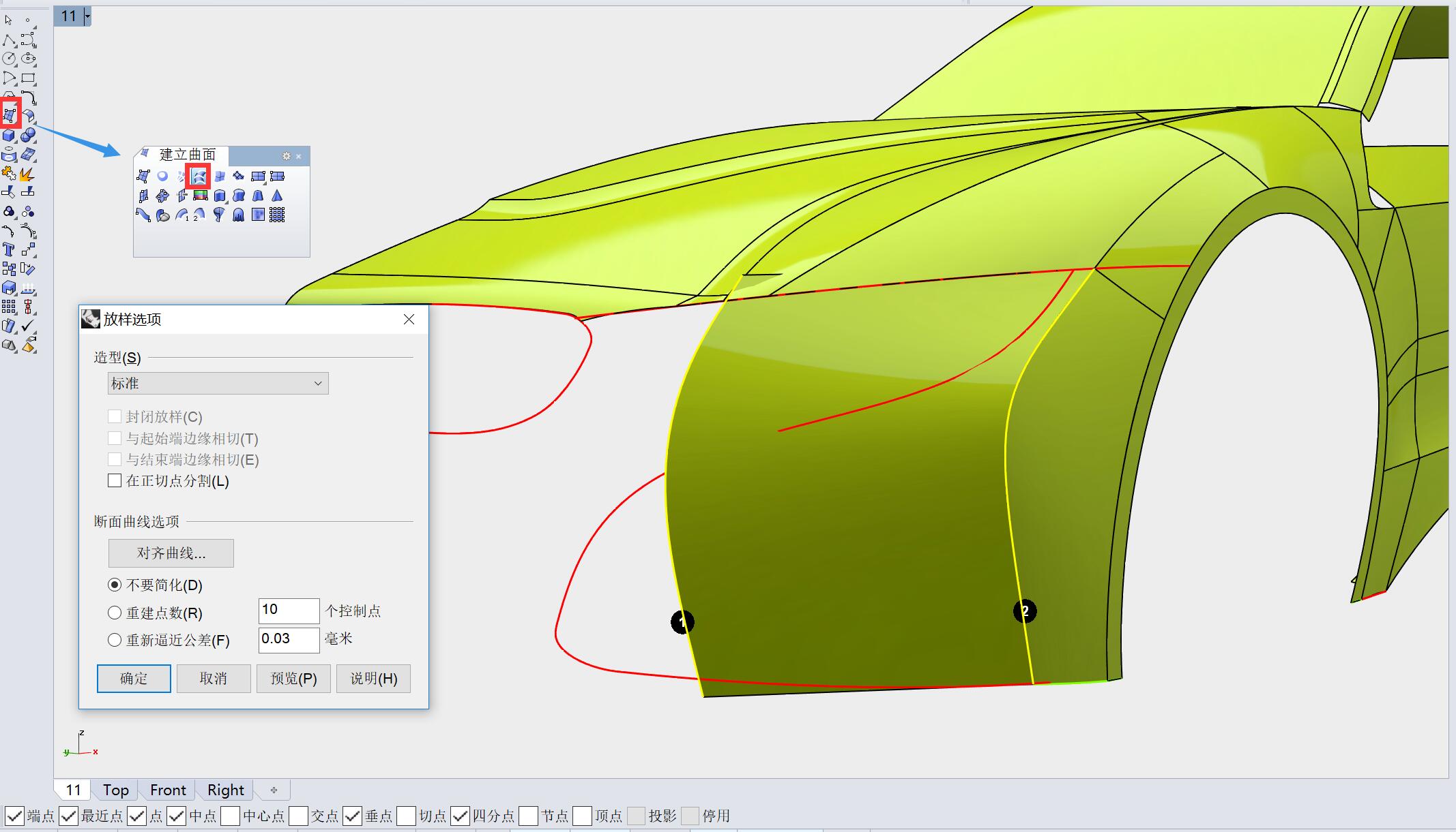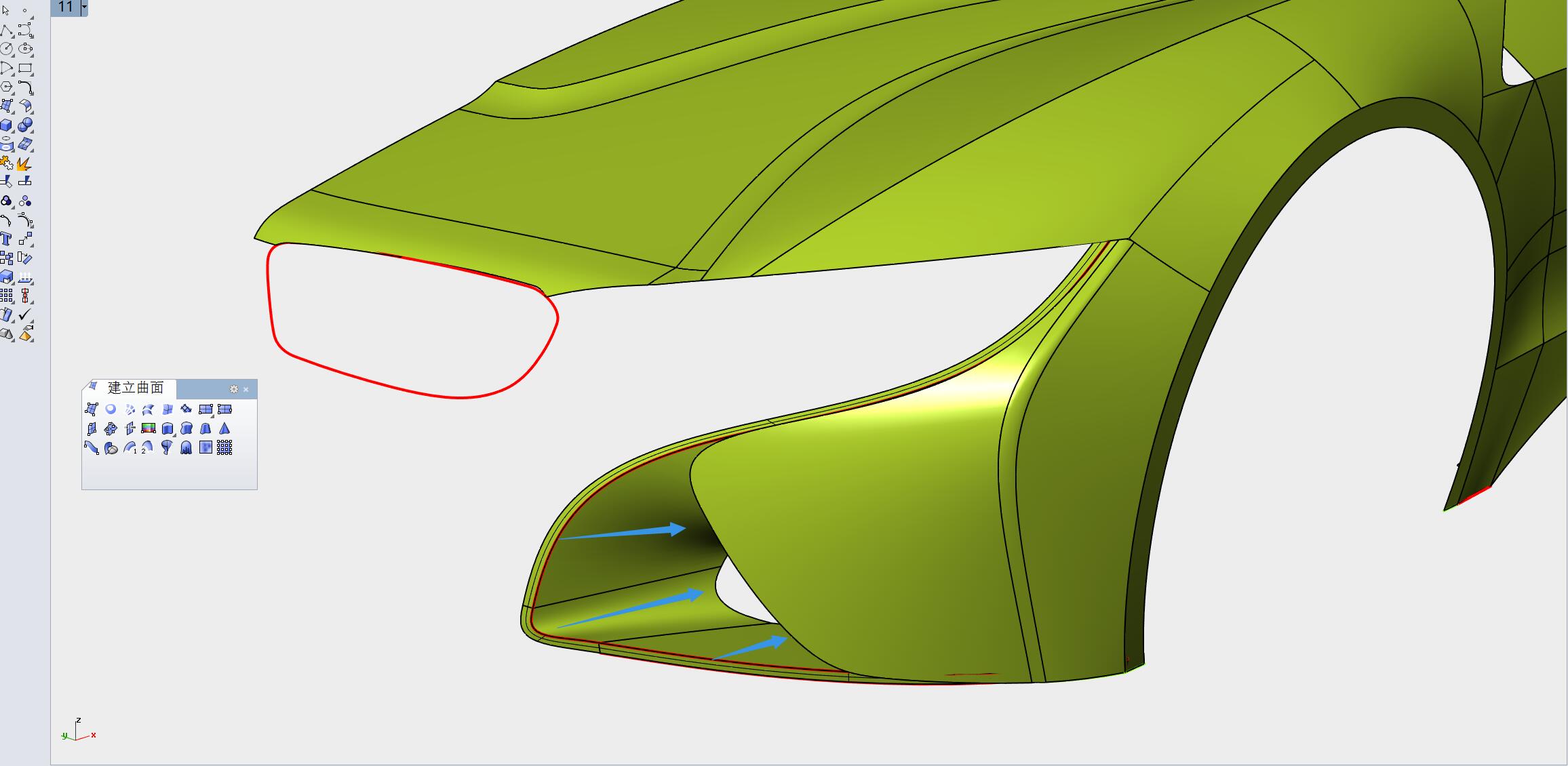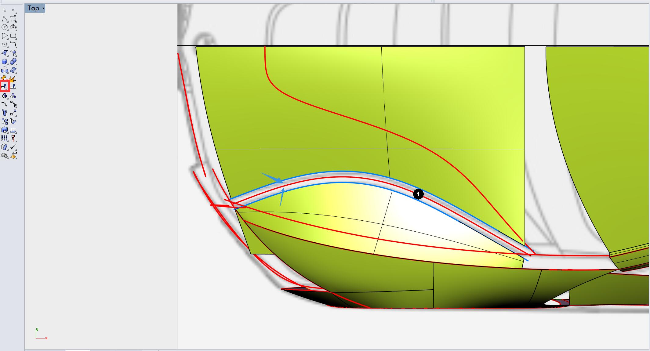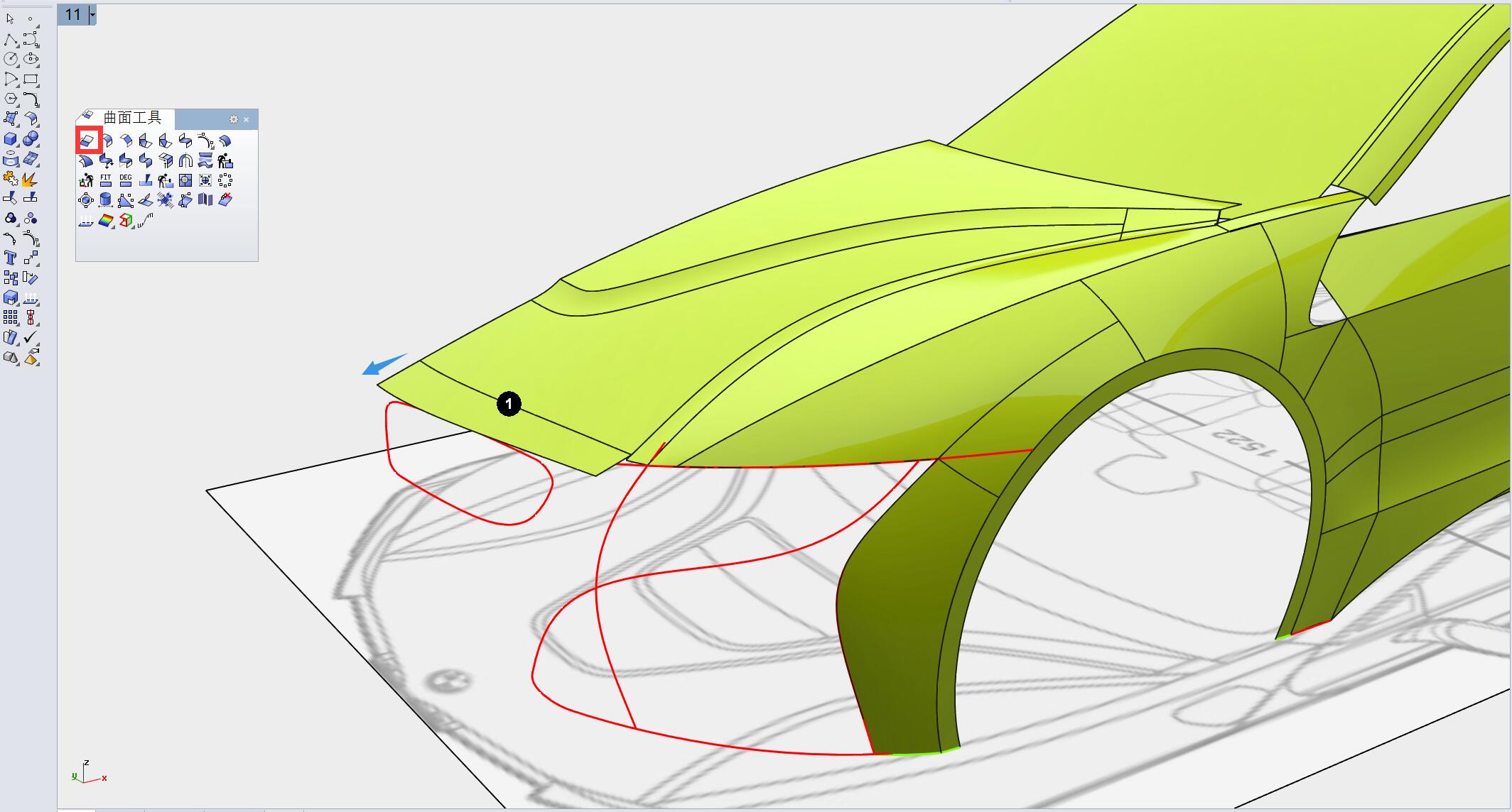 切换至顶视图,用曲线对曲面箭头指示部分进行修剪。