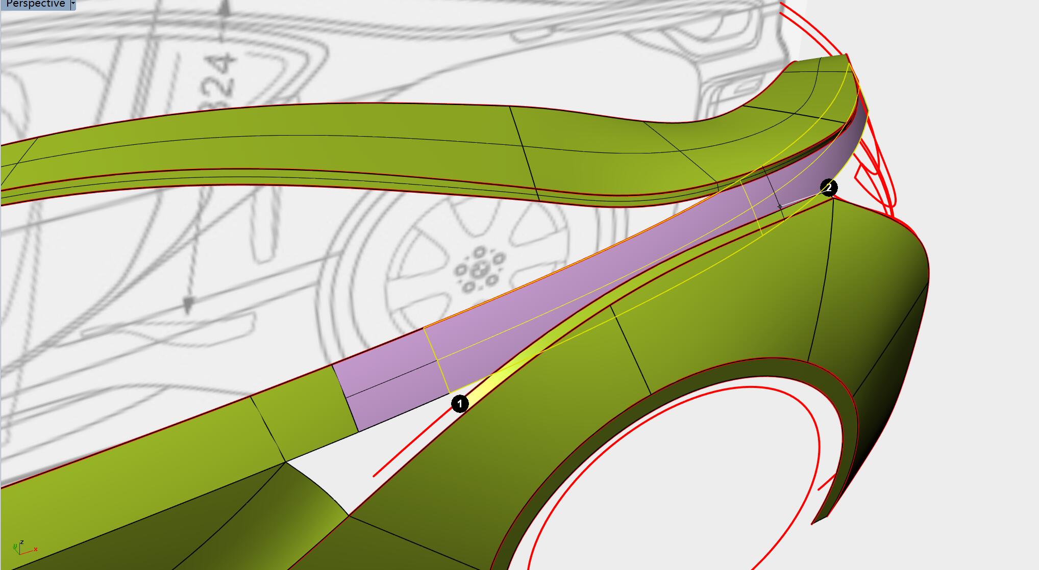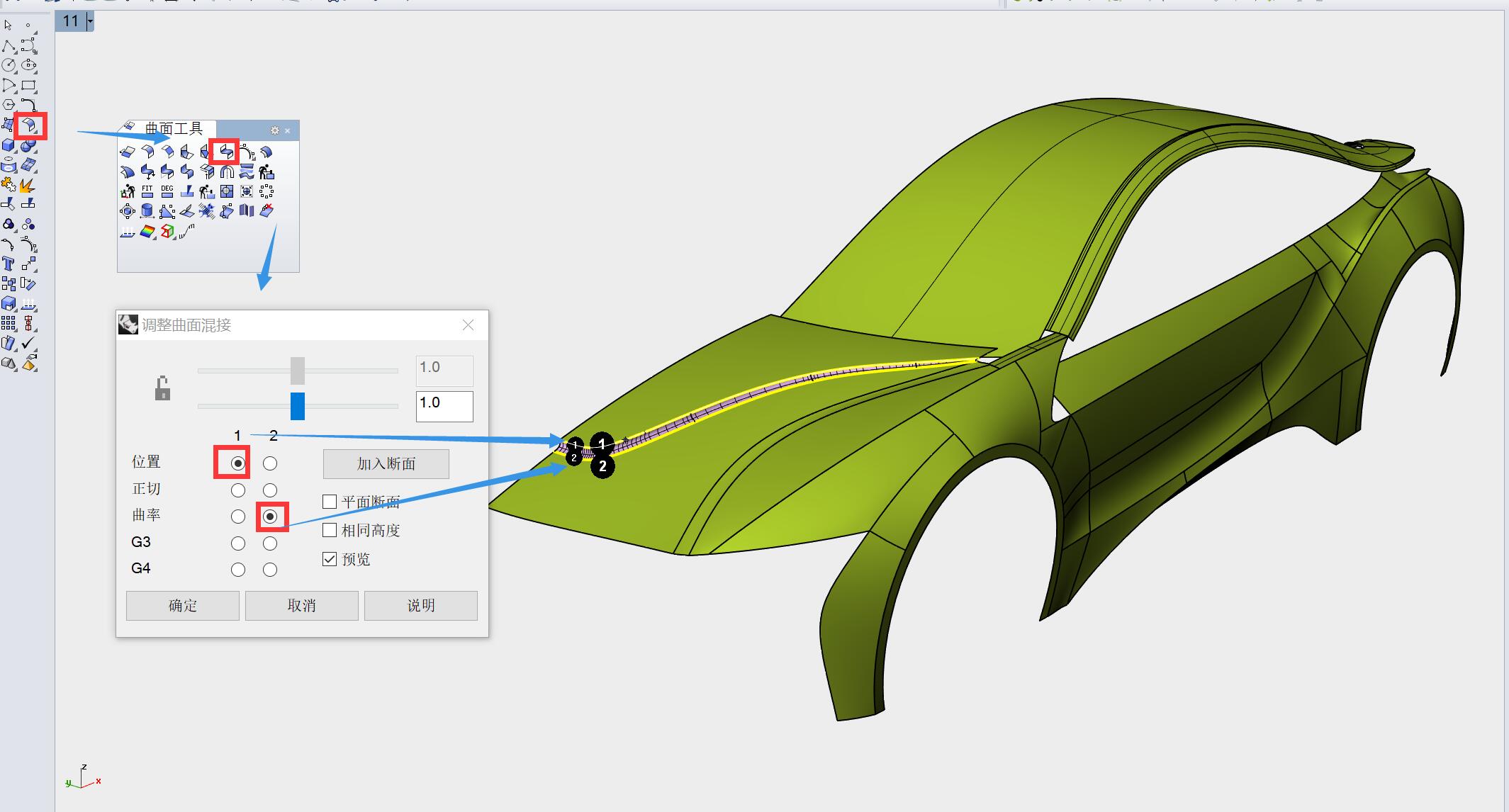 以1、2曲面边缘进行混接,曲率连续,得到过度曲面。