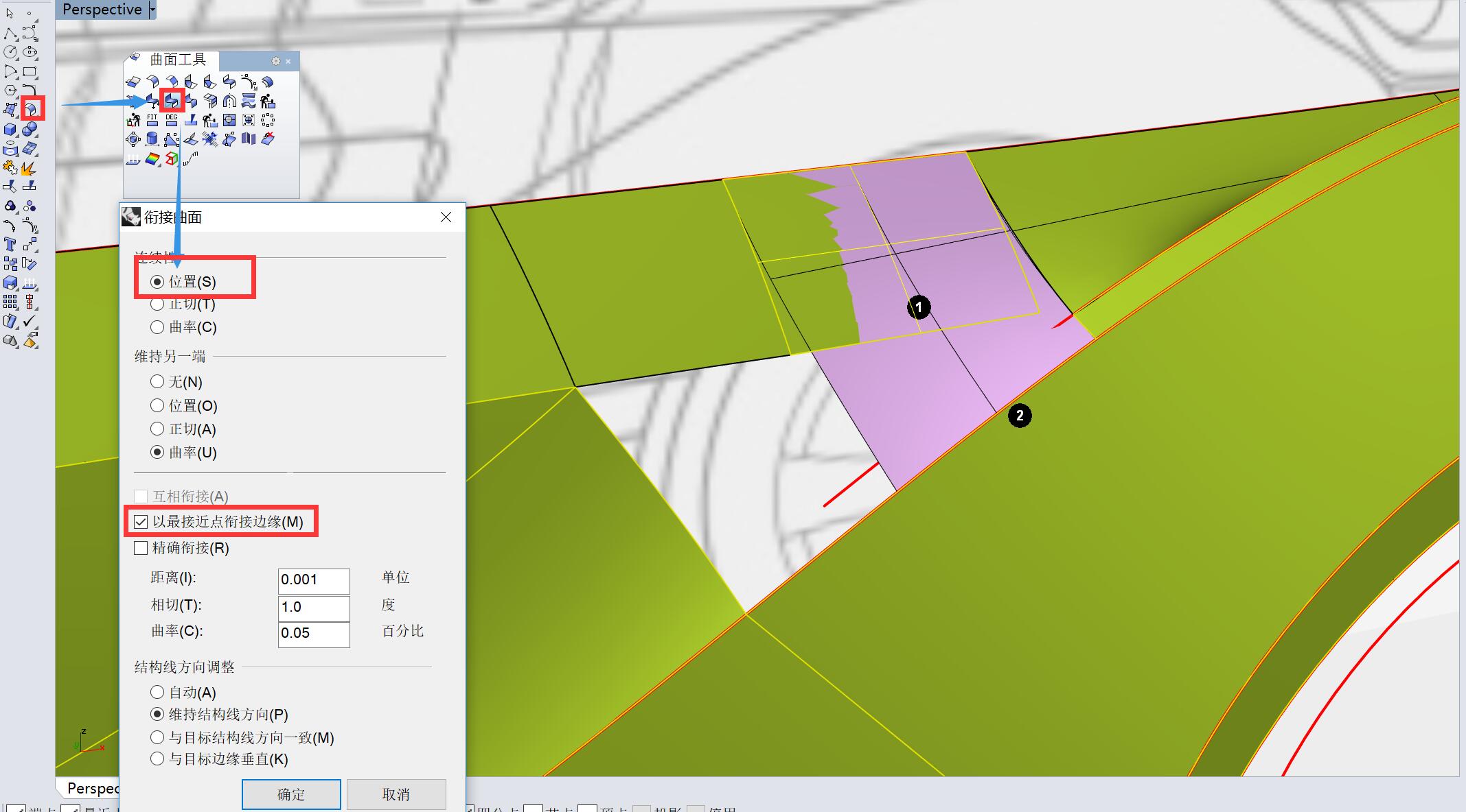 用曲面衔接工具,曲面1边衔接至曲面2边,位置连续。