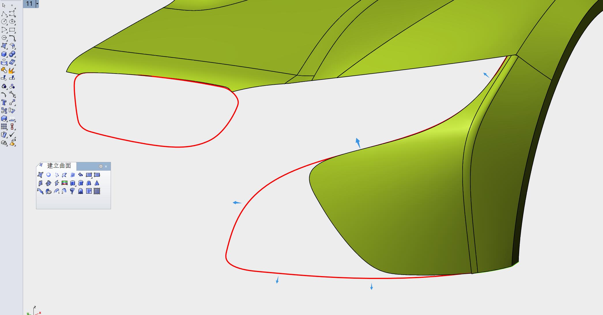 在用偏移得到的曲线对复原的曲面进行修剪(剪掉蓝色箭头指示部分)