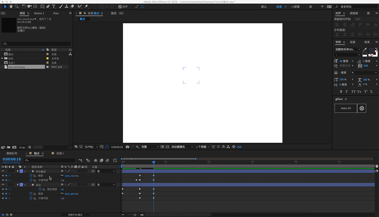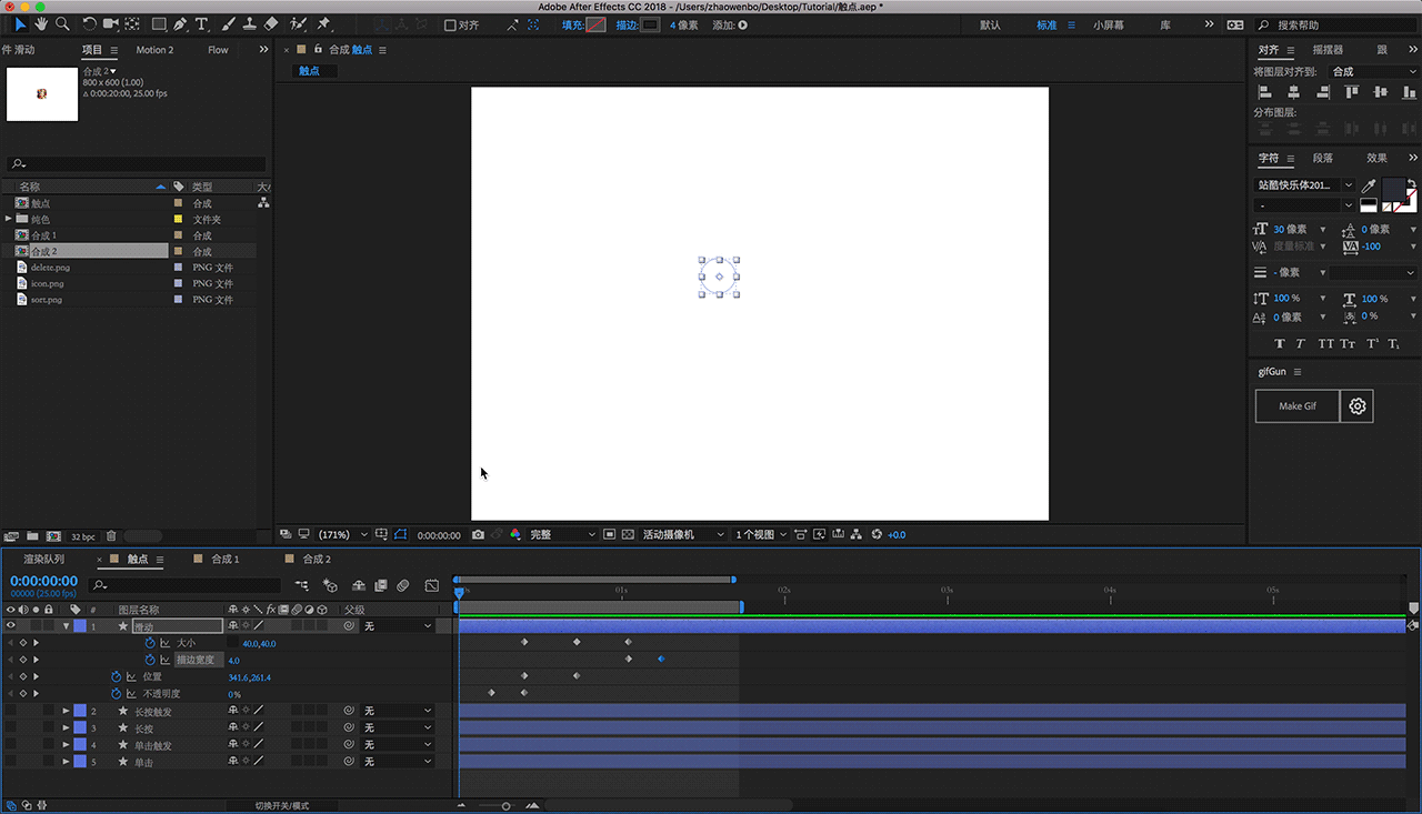 Step10 单击效果完成,将两个形状分别命名为单击触发和单击,复制到已经做好的动效合成中,调整合适的位置和时间轴后预览