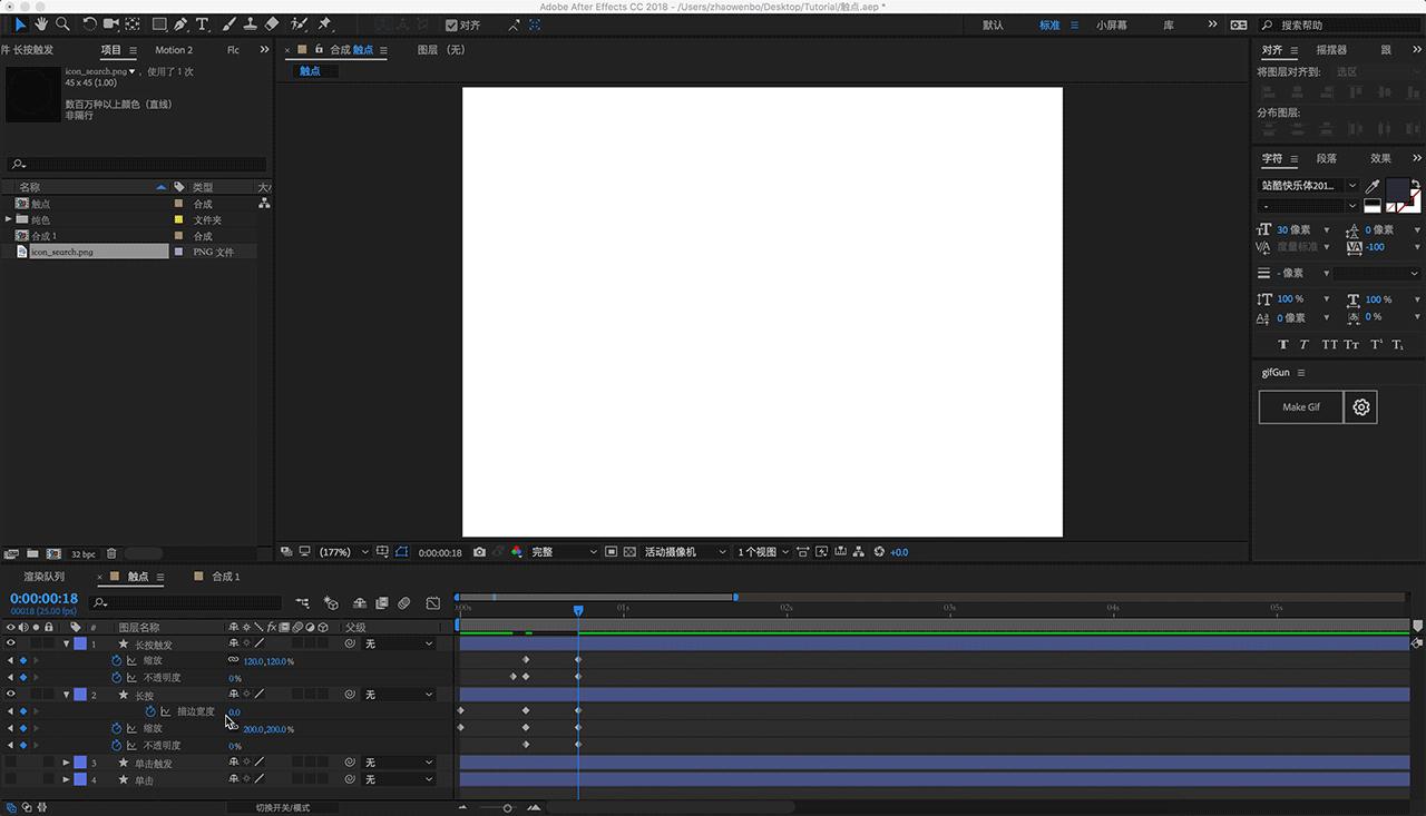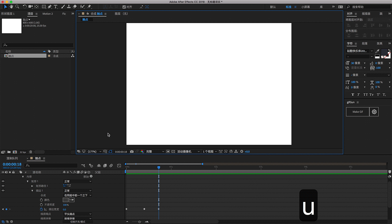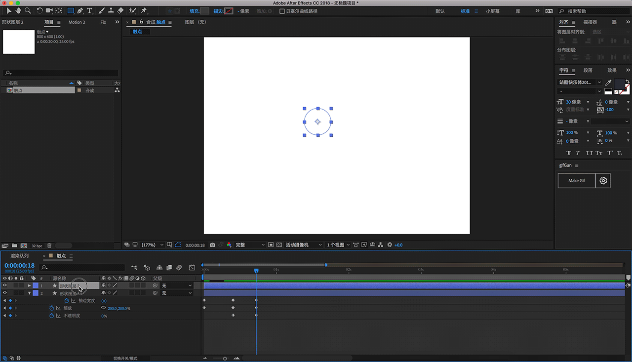 Step4 描边宽度打上关键帧,第0帧宽度0,第10帧宽度12,第18帧宽度0,可以直接把第1个关键帧粘过来