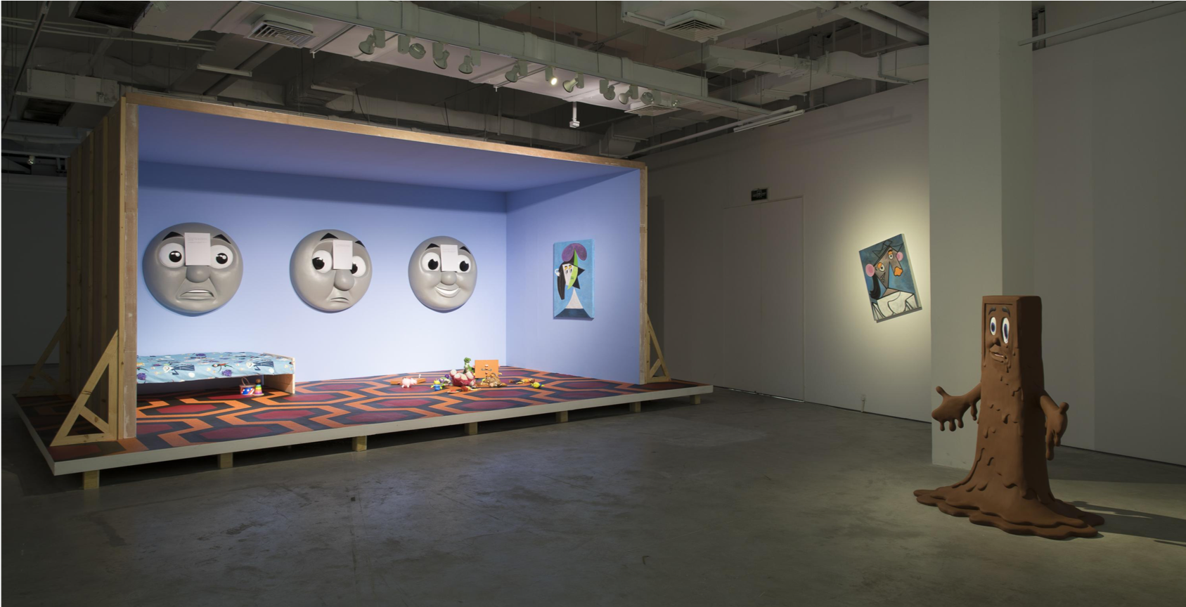 陆平原:所有的这些卡通元素在今天都像一个流行符号一样,可能本身就是一个现成品,一个现成经验。在创作艺术的时候,我在挪用这种现成经验来为我的创作服务,挪用它来为我制造一个语境,像这次菠菜罐子一样,整个展厅有点像我故事的语境。