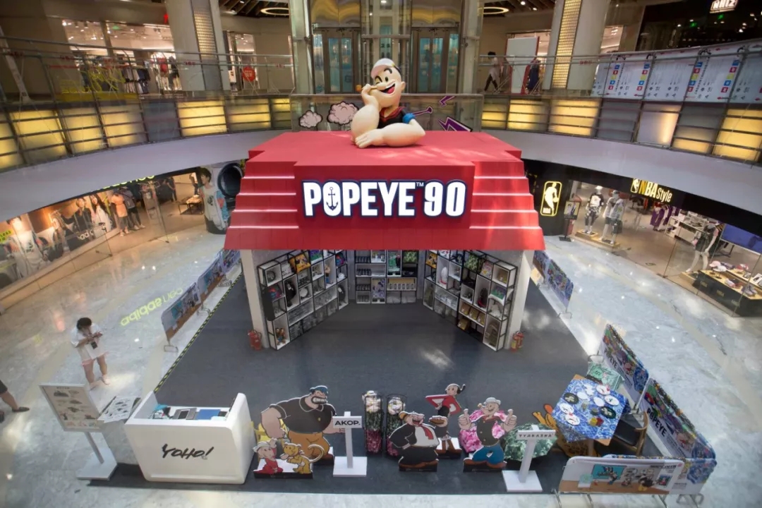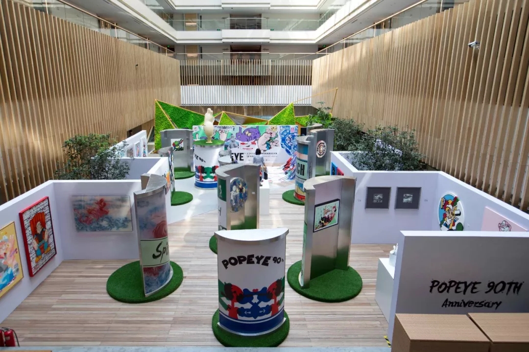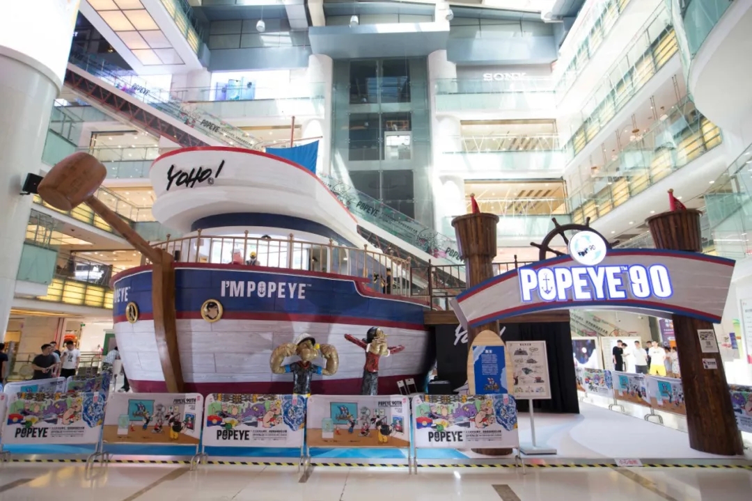 『大力水手90周年·奇梦航旅潮流艺术展』主要由4个部分组成,航海船展示区、贩售区、菠菜罐主题展区及广场艺术区,横跨西单大悦城多个楼层。