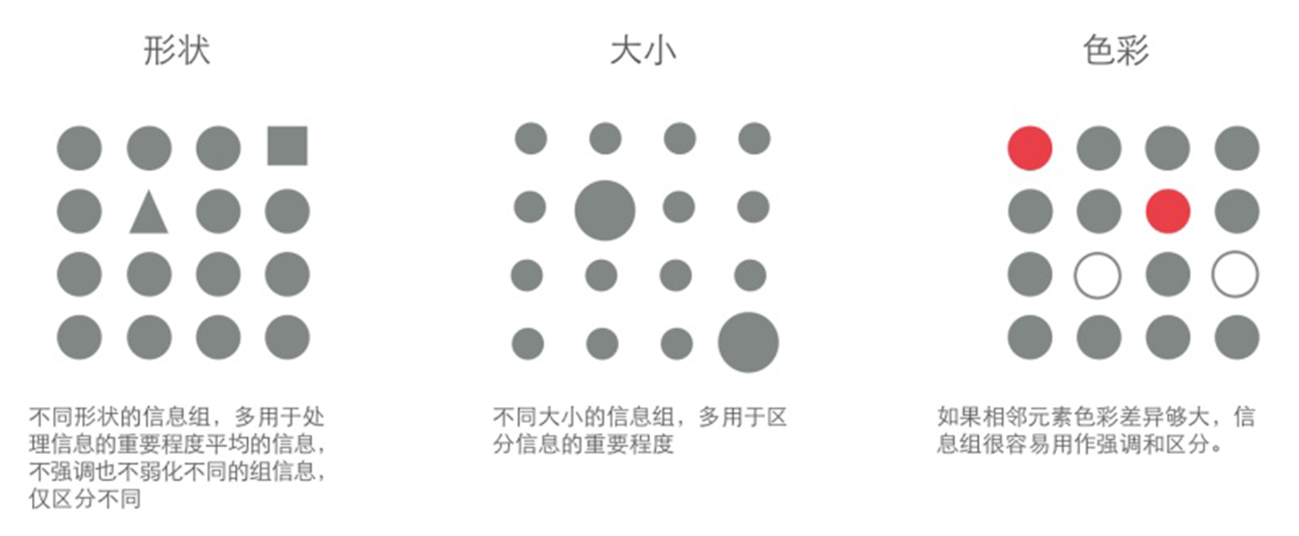 原理总结:人们对具有相同特征的元素,会进行归类,我们在界面中做元素的时候,需要对相同功能的内容进行样式/元素统一,不同功能的内容尽量避免样式同质化产生混淆。