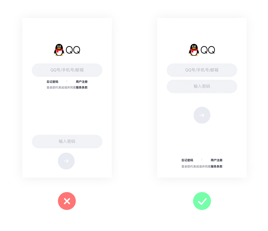 注册界面正确的流程是 输入账号—密码—登陆 合理的排版应该如右图,账号密码最为接近,其次是登录按钮。但是左图明显是错误的情况下,有格式塔相近原则在,我们仍会下意识认为他们是一组的,他们是具有关联性的,这就是我们受到格式塔相近法则影响的后果。