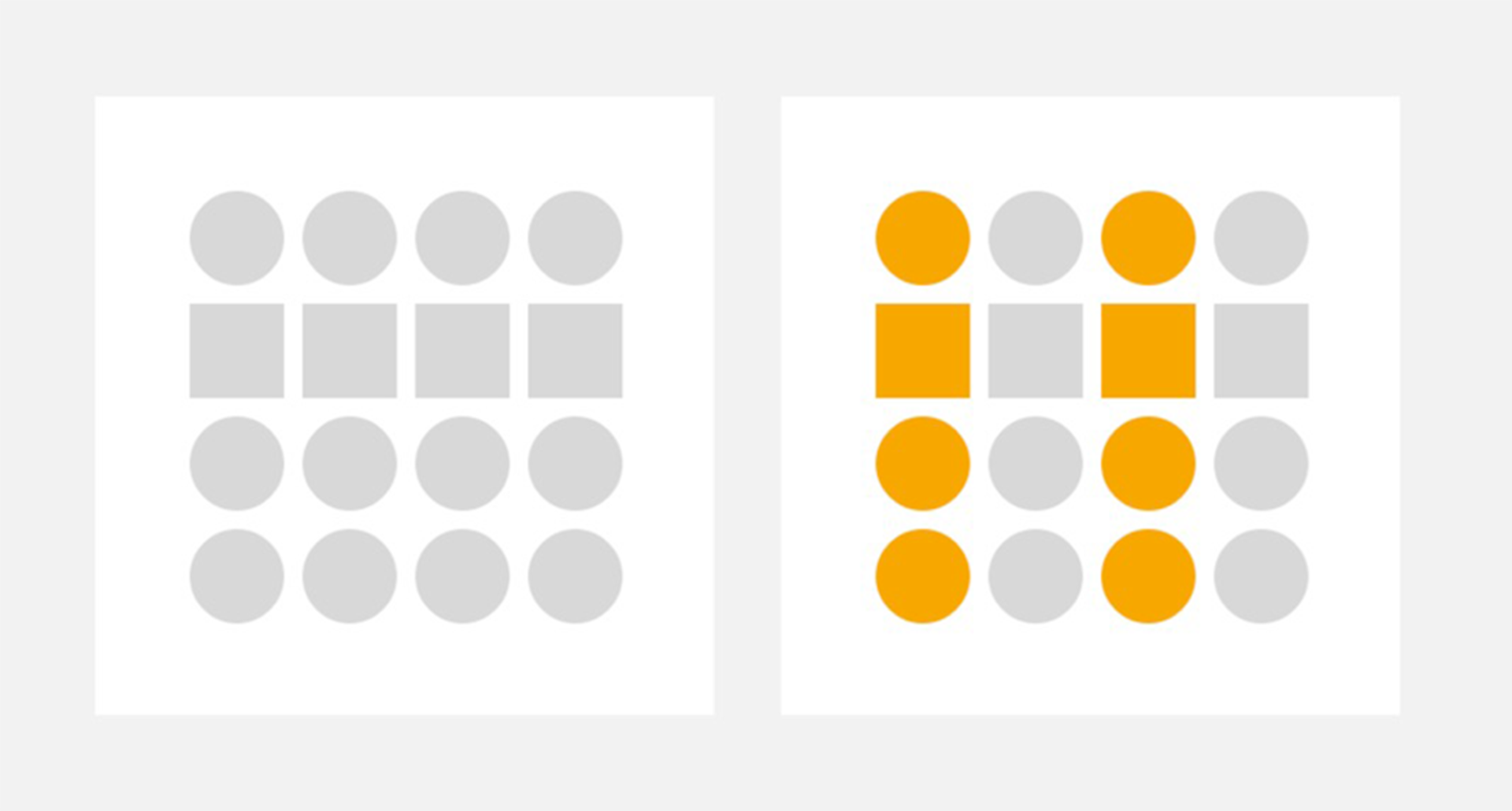 比如下方第一幅图,大家会把同行的正方形当成一个整体,其他圆形当成一个整体。第二幅图,人们就会把大正方形当成整体,小正方形当成另一个整体。