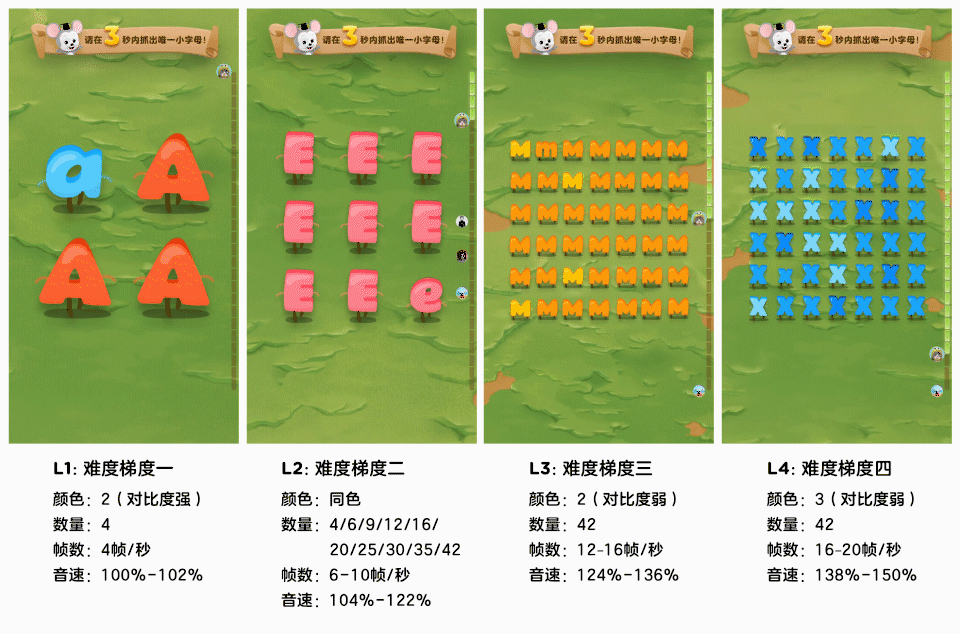 初期也测试了多种找不同的内容形式,连线找单词、寻找不同字母、寻找唯一小字母等,并对几种形式模拟测试了用时及难易度,为搭配完整的26个字母,保证语音与画面高统一与和谐性,最终敲定了方案“寻找唯一小字母”。同时对游戏的入口、流程、关卡设置、结果展示以及评分排名机制也进行了初步的游戏策划。