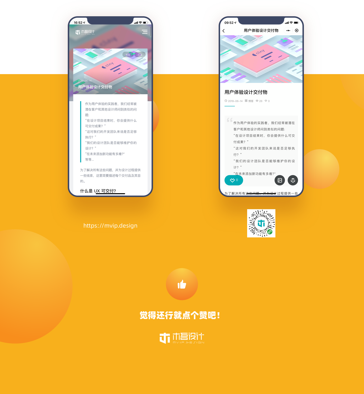 个人网站(mvip.design)与我的个人小程序(木头印记)的效果展示,可以对比一下与站酷的效果。有兴趣的可以观摩一下,欢迎大家交流。