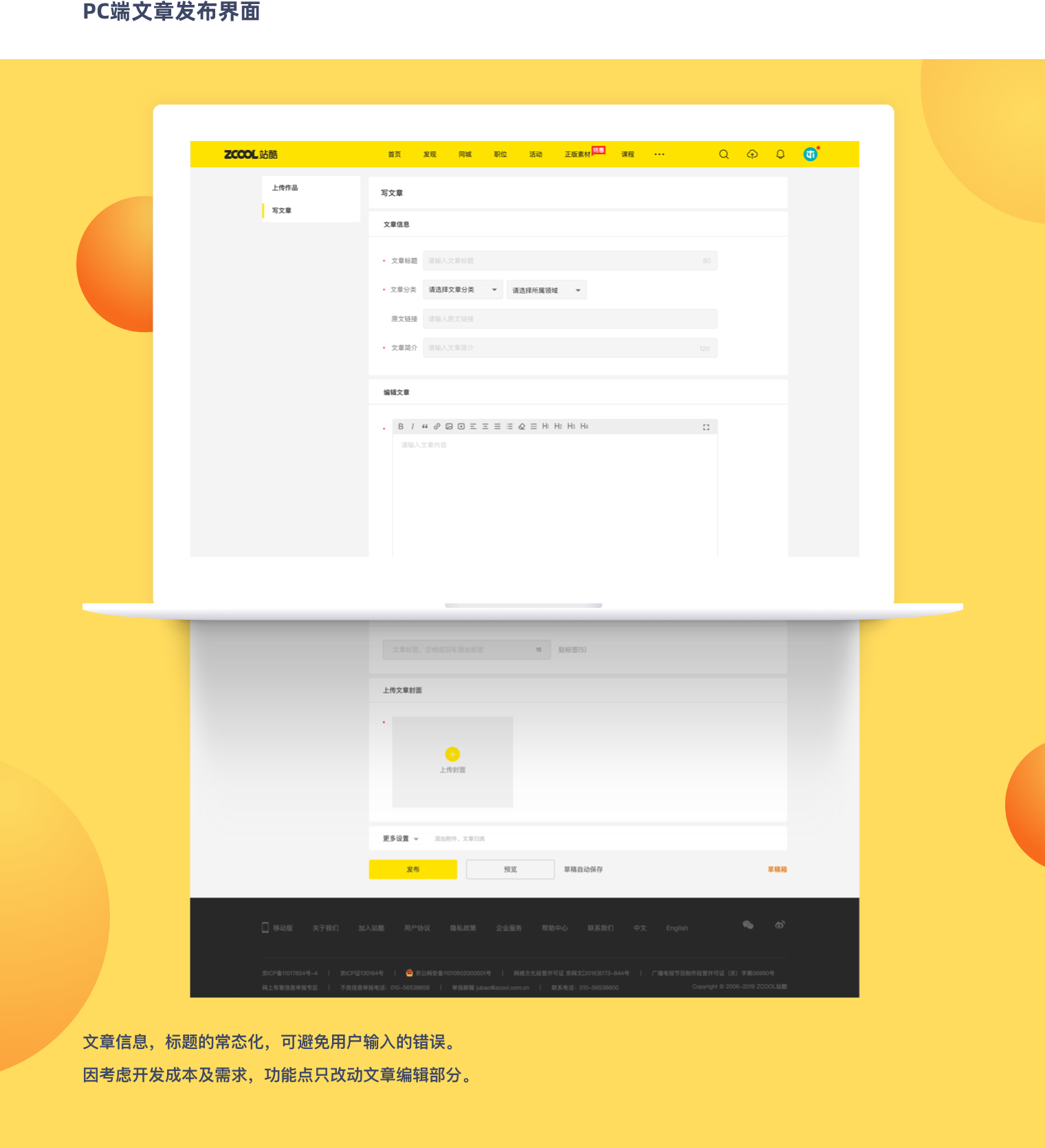 前者这里不做讨论,现在主要是对目前的文章发布,及一些问题做一些思考。站酷文章发布,主要功能模块架构为: