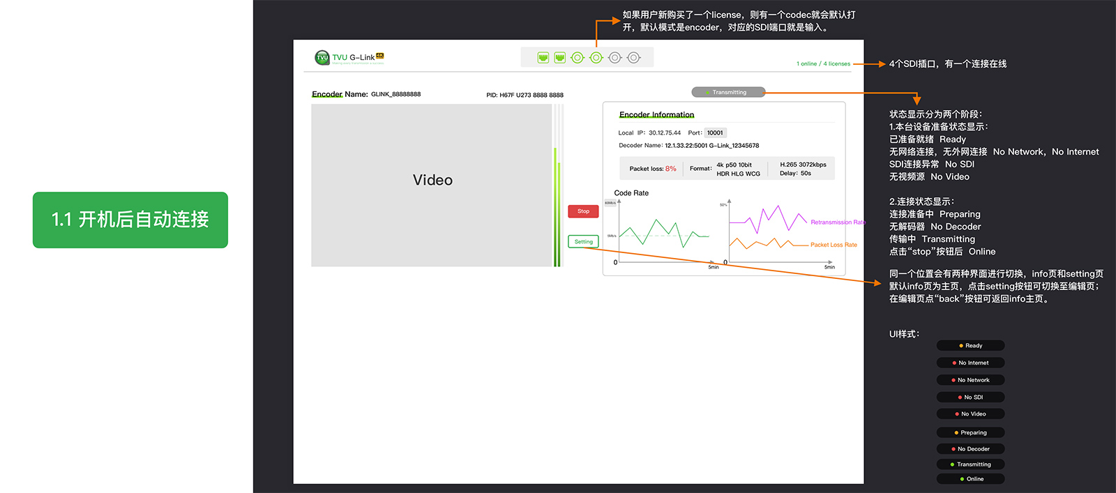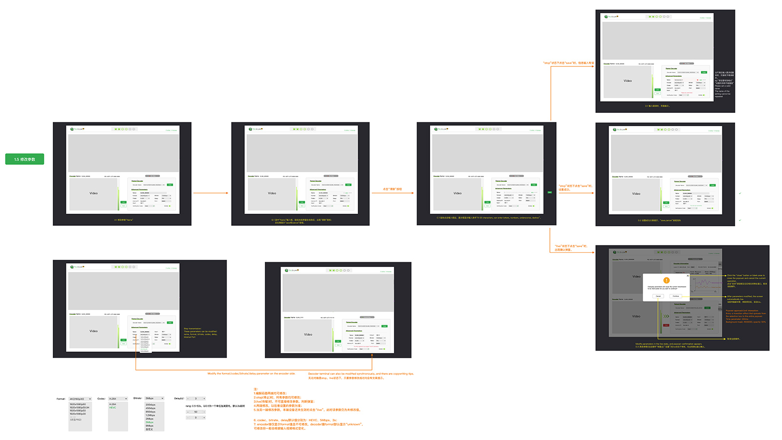 encoder和decoder两端的“stop”和“live”按钮的含义:停止传输、开始传输;对于用户来说,“传输”是一种状态,对于开发来说,我们要给“传输”制定一个规则:什么操作能够触发传输,什么操作可以停止传输。项目中,涉及到编解码器两边的设备,而“传输”是二者之间连接且正常工作的状态... ...(此段业务内容可忽略哈)