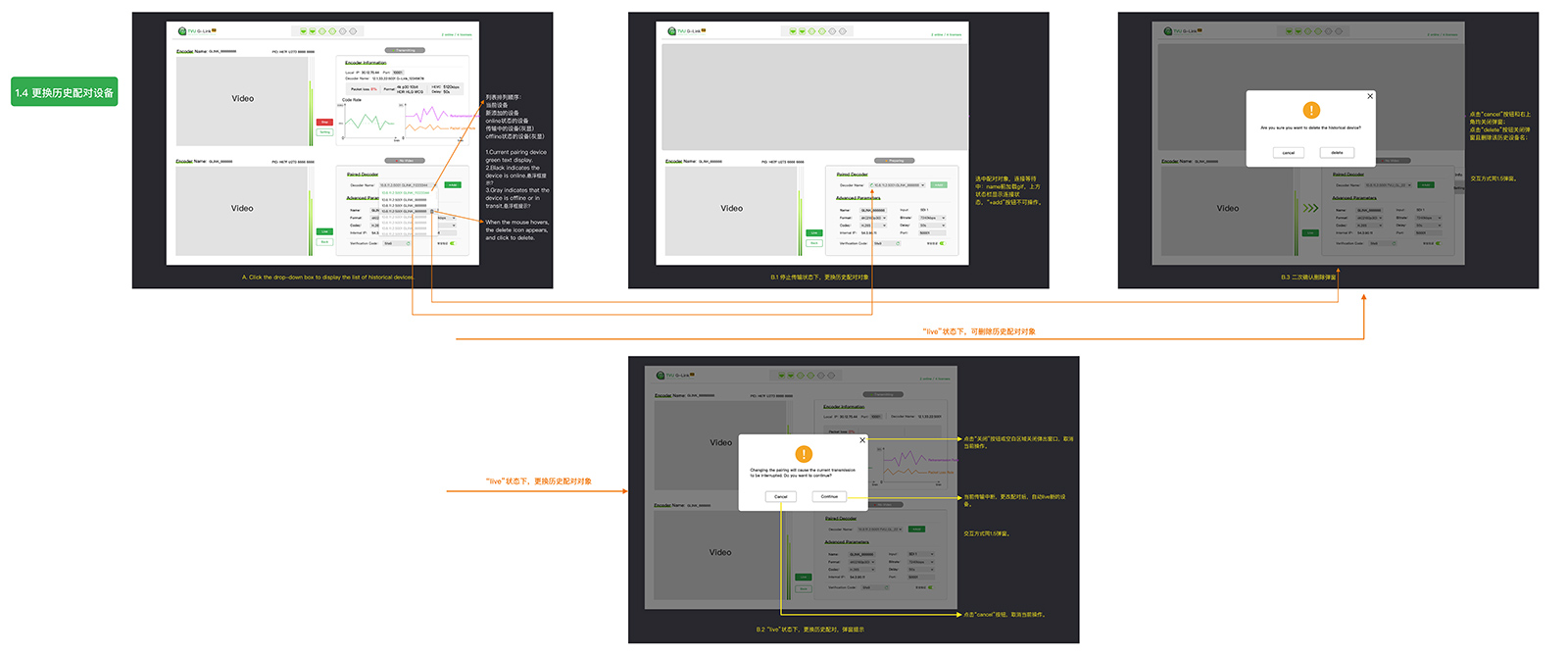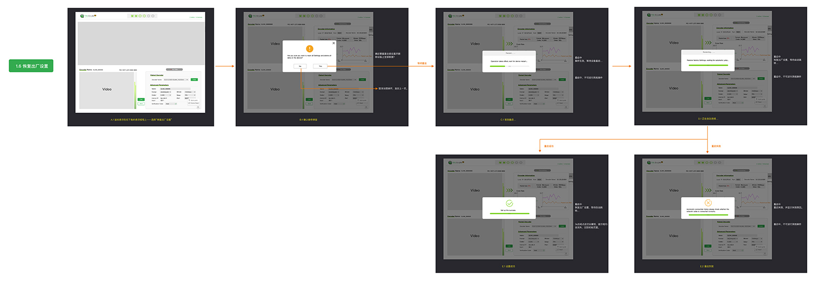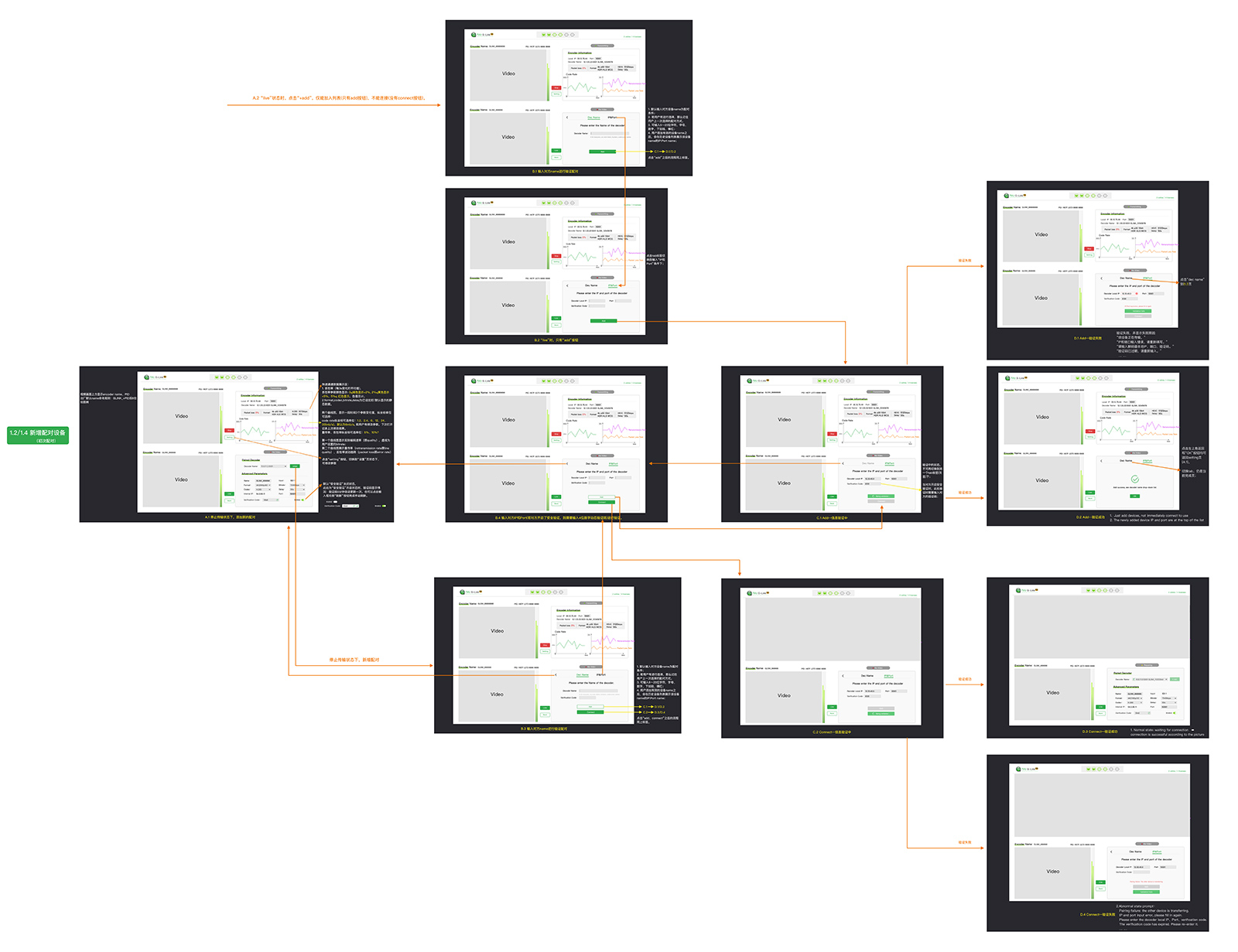 从《1.1 开机后自动连接》《1.2 自动连接失败、手动连接》《1.3 手动Live和stop》《1.4 更换配对设备》《1.5 修改参数》《1.6 恢复出厂设置》《1.7 快速指南》这7个流程结构,绘制原型UX和UI图~