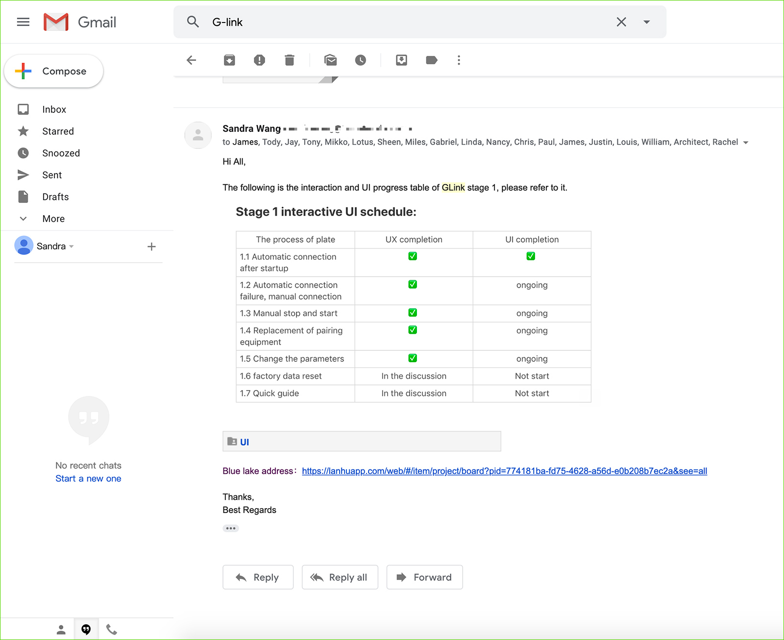 5. 另外两点,有的公司会需要用户体验设计师邮件定时email领导同事,汇报项目进度,一般可能邮件中大致描述下,然后发送Google Drive(原型)链接,蓝湖(UI效果图)链接就完事了;