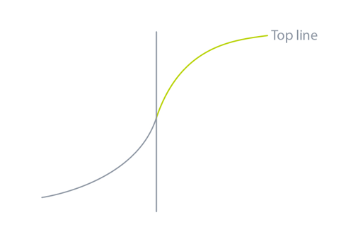 第二条曲线叫做双曲线,左边这条曲线叫做fictitious line,fictitious这个单词有虚幻的含义,说明了这种发展路径会给设计师造成学习假象。这类设计师通常偏技术流的居多,他们掌握更多的是设计的方法,一项技能从不会到会的过程中提升得特别快。但从整个职业发展路径来看,他们会在技能掌握到一定程度后进入到发展平缓的阶段,因为仅仅技能的掌握并不代表拥有解决项目的能力,瓶颈也就相应出现了。