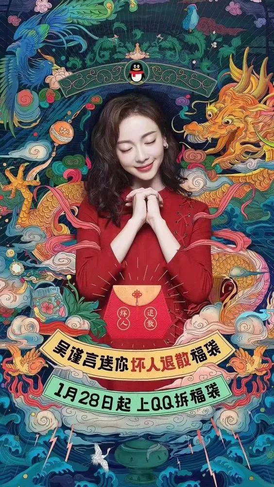 杨超越身上穿的浅色连衣裙可以很好的与底部中国风背景相结合,而人物也不会因为背景过于复杂被弱化。