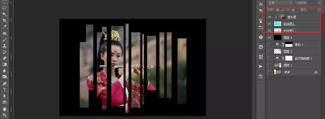 创建完成后,显示层就只显示形状层的那部分图像。这里的形状层为广义的形状图层,只要不铺满整个画布,周围有透明像素即可。