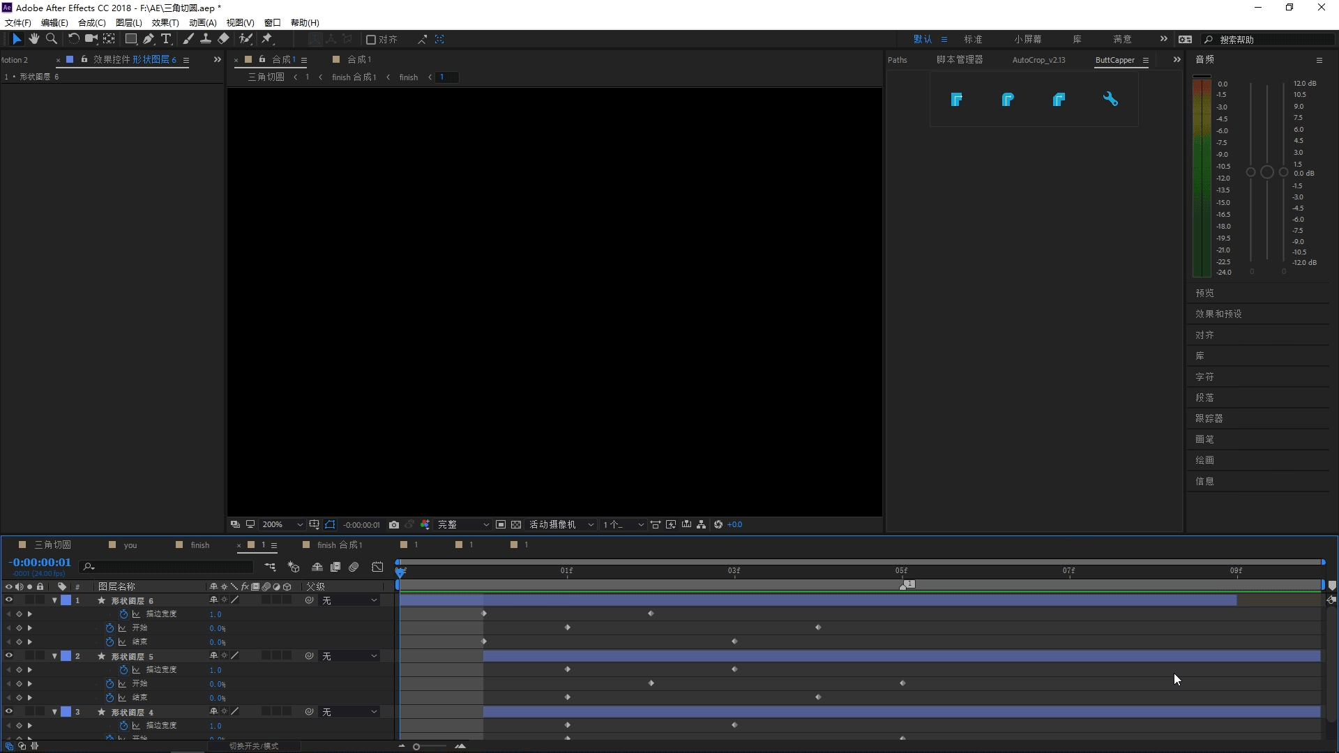 2. 做完了333,接下来,就是刀锋了,其实与333做法是一个道理,仅仅是给线段路径添加了修剪路径的效果,然后更细致一点的话,给描边宽度也k个帧,让”刀锋”除了有运动效果,也有一个逐渐消逝的效果,这里我做了三个“刀锋”,你也可以按自己的想法再增加几条“刀锋”。这里展示的是右边的“刀锋”,同333,其他“刀锋”最好自己另外画,这里我偷懒了,同样仅仅旋转了一下(反省*2)