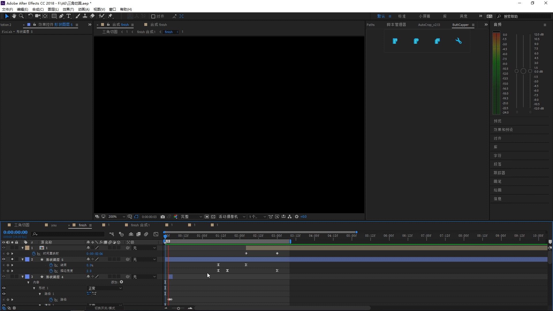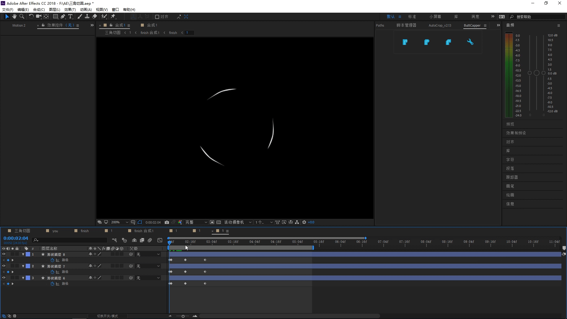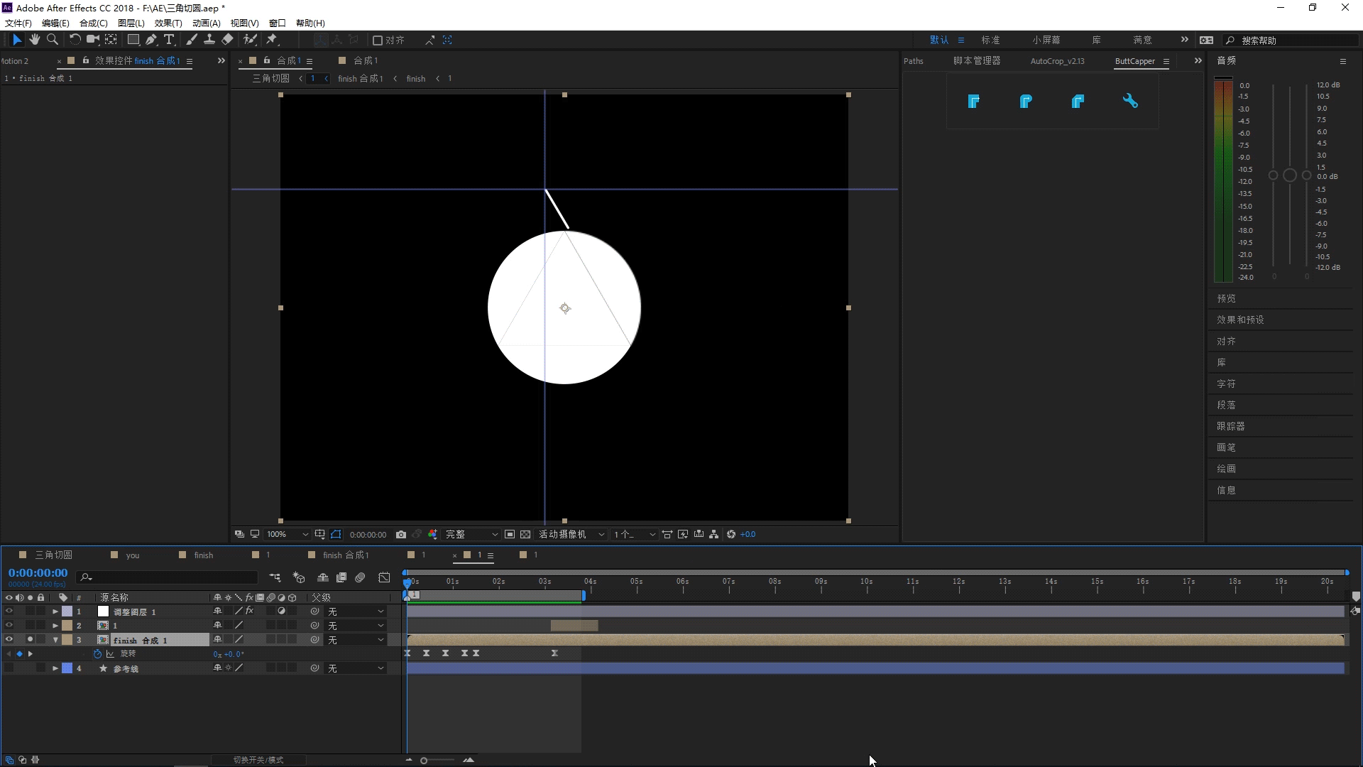有注意到我之前有绿色的1.,2.吗?这就是问题所在。如果你觉得整个动画按这样的顺序做事理所当然的,那就要注意了,这里应该先做2.,再做1.。大家想一下,先有“刀锋”还是先有切割?“刀锋”的运动节奏控制简单还是切割路径k帧简单?这两个问题一解答,豁然开朗:先做“刀锋”动画,因为“刀锋”的节奏控制切割节奏,而且“刀锋”动画易做,且可以作为切割动画的参考,无论是切割快慢还是切割的时长。
