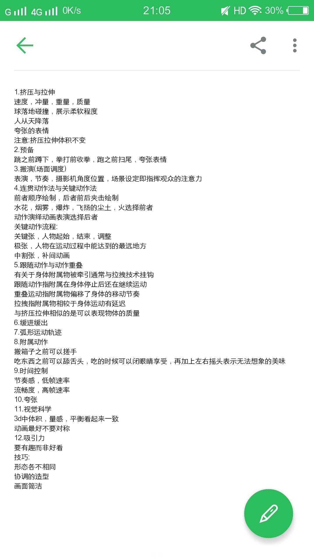 1. 可以看到我基本是逐帧逐帧k出来的,至与这么做的原因:就类似与烟雾,火焰,液体,这一类的不定形的动画最好的方法就是手动k帧,而且最好是逐帧逐帧的k。这个是迪士尼动画十二原则里面的第四条,下图可以看到。这是我做的关于动画原则的笔记,每次我的临摹或是原创我都会去体会与运用这些原则,让这些原则深深的烙在我的大脑里,这比去看油管主,up主,各种免费或收费教学视频要实在的多,这些原则也是我在视频或文章里面一直一直不断强调的东西,虽然固定,但是确确实实可以说是定理。(动画十二原则原视频在油管,不过b站有人搬运了,可以通过关键词“十二原则”搜到)
