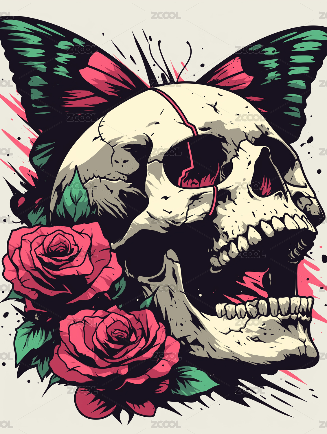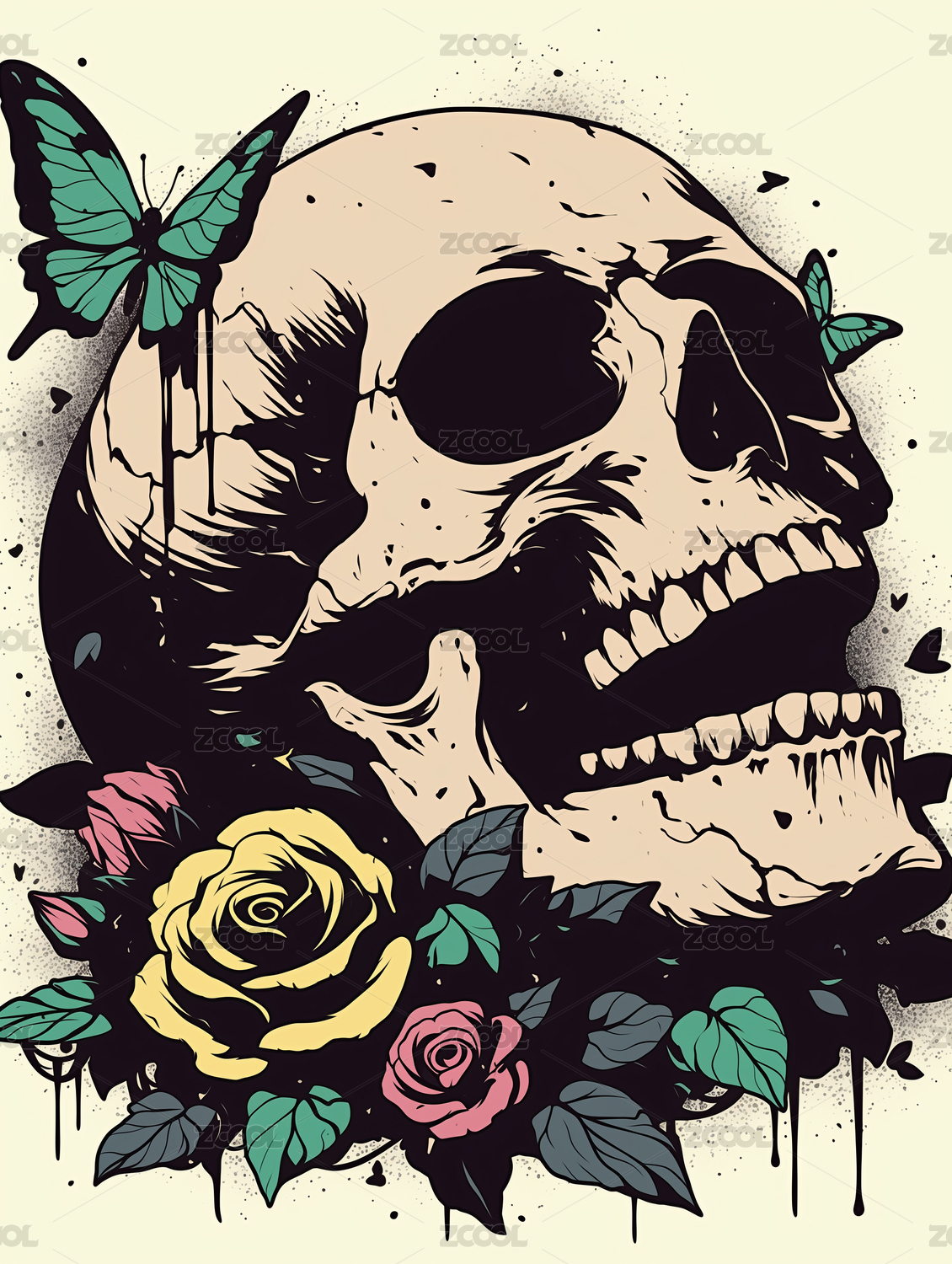 骷髅头玫瑰花蝴蝶暗黑风潮流插画