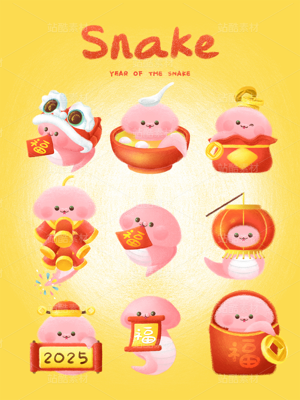 | 作品应用:可广泛应用于多种设计领域。01平面设计(服装图案打印,海报元素,宣传页元素,主kv元素,装饰印刷,贴纸,活动形象,活动物料,蛇年物料包含红包,日历,对联等宣传物料)02空间设计(活动形象,商场,美陈布局,气模等)03产品包装(农产品包装,例:对应水果)04产品(例礼盒,拖鞋,冰箱贴,手机壳,创意贴纸,抱枕,鼠标垫,马克杯等)