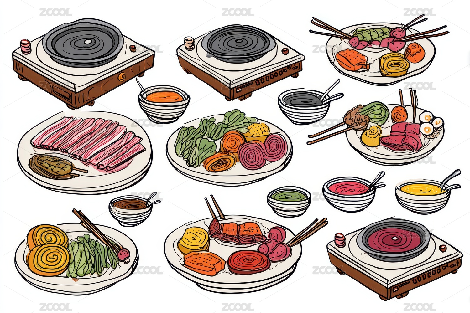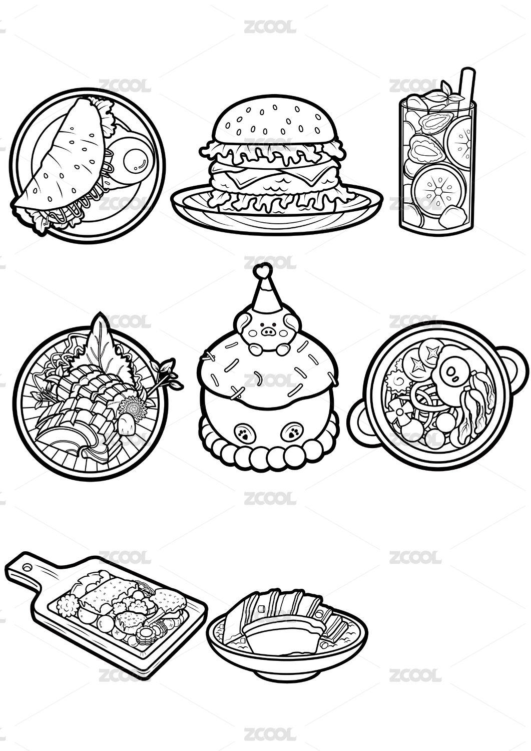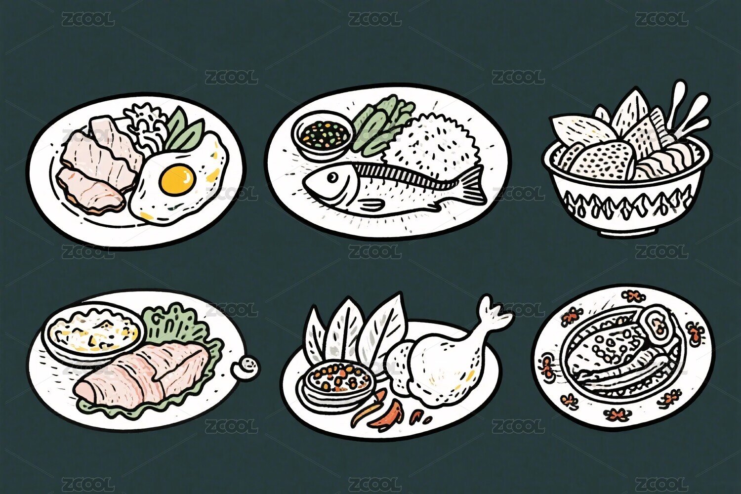 从餐饮品牌太二酸菜鱼提取的灵感,用黑白木刻版画的形式画了一系列餐饮小元素,包括各种餐具,菜品,古代器具,海鲜形象设计,角色形象设计,泰国元素等,适用于国潮餐饮品牌插画包装