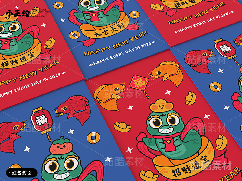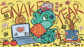 蛇年将近,画蛇添福,采用鲜艳的颜色绘画可爱的卡通蛇给打工人传递积极向上的力量,希望大家来年福气多多,有钱有闲