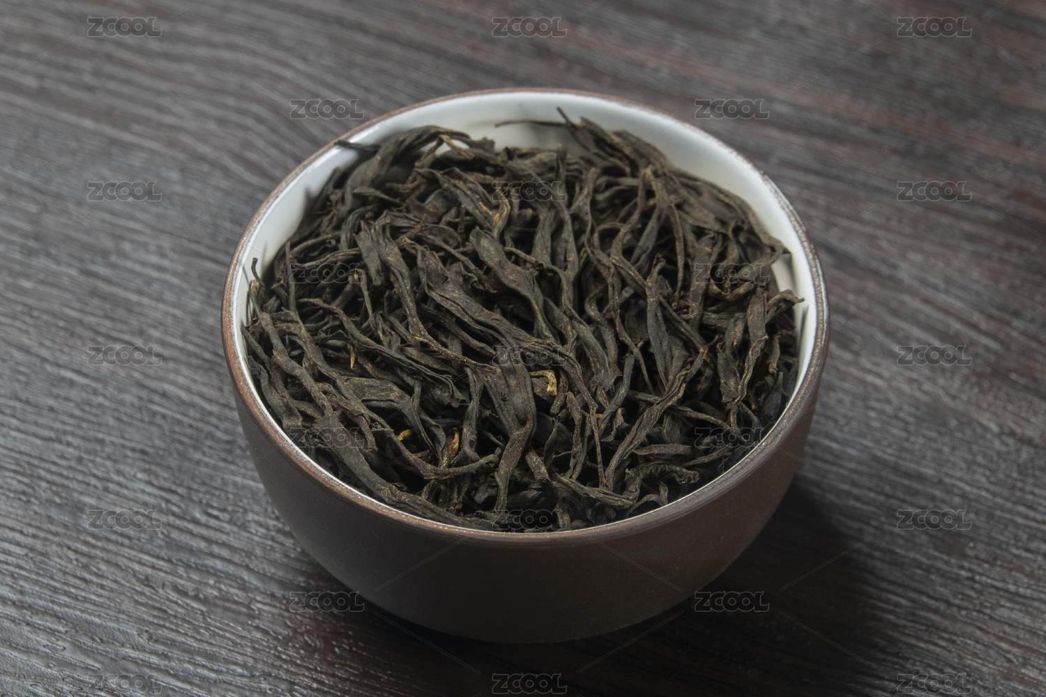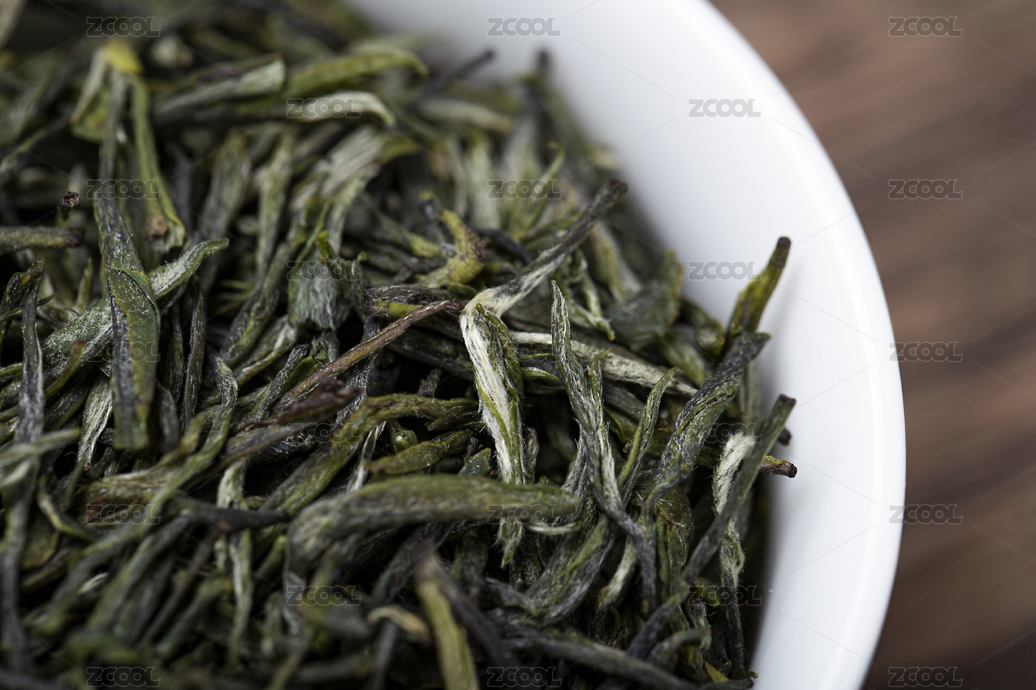 在重竹茶台上用白瓷小杯盛满信阳毛尖干茶近距离特写