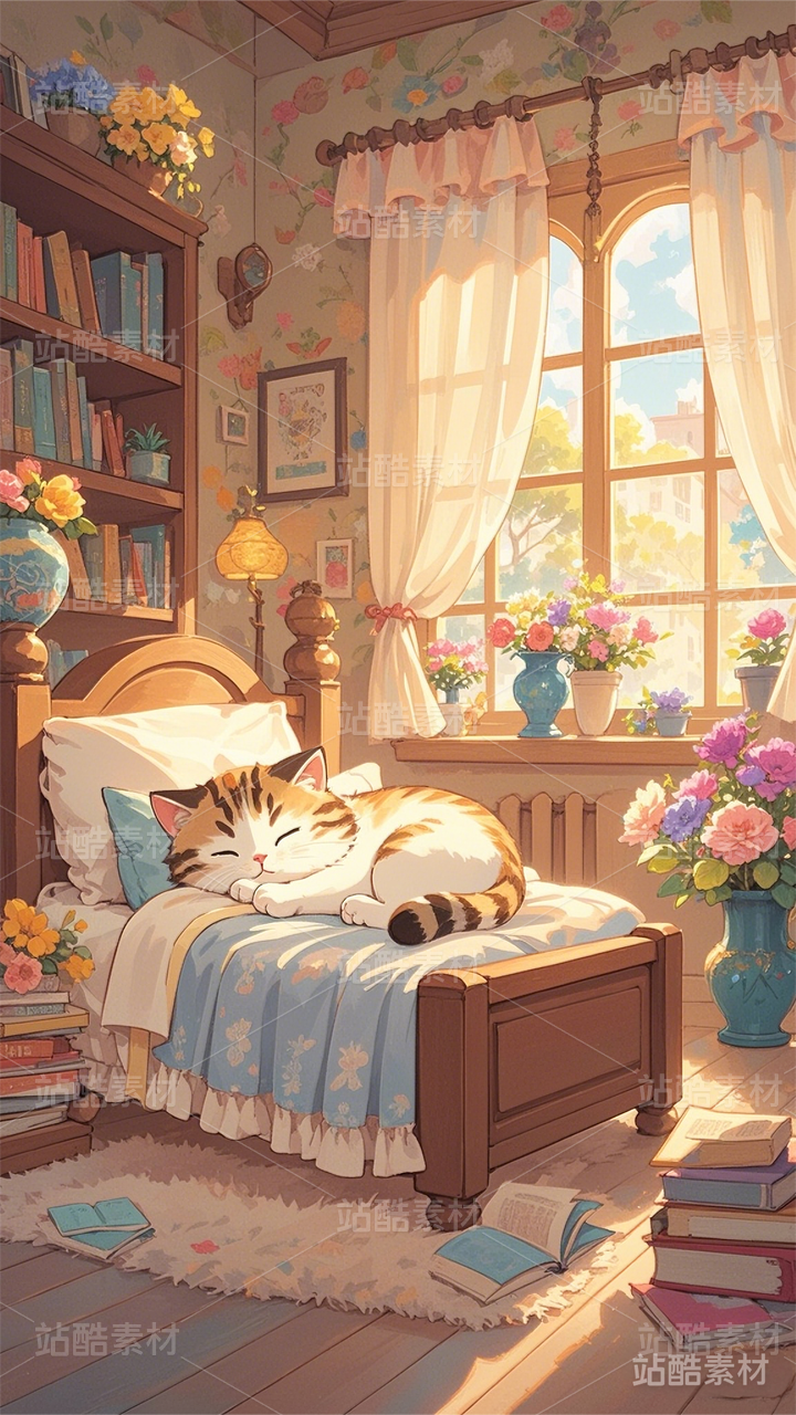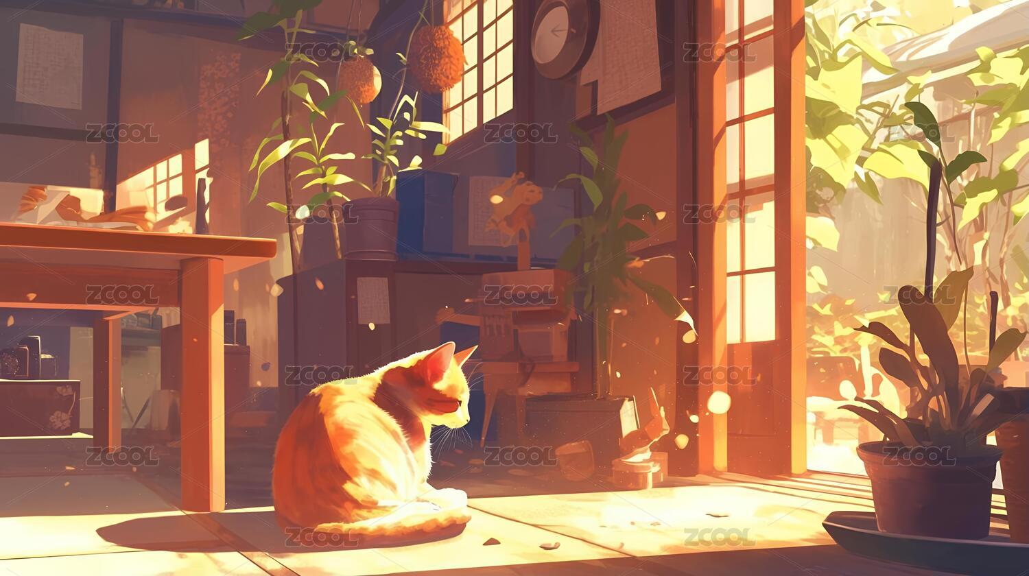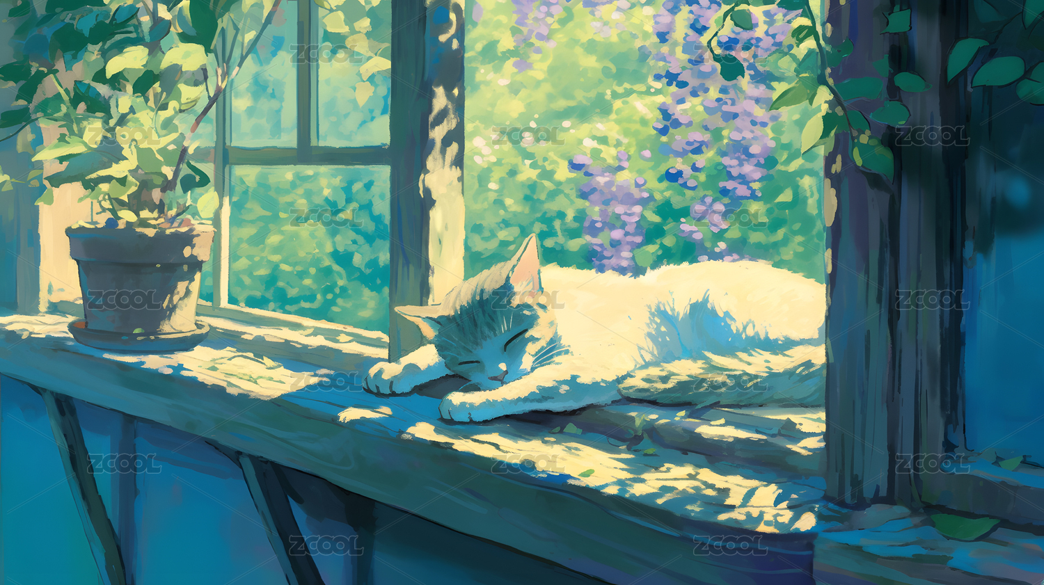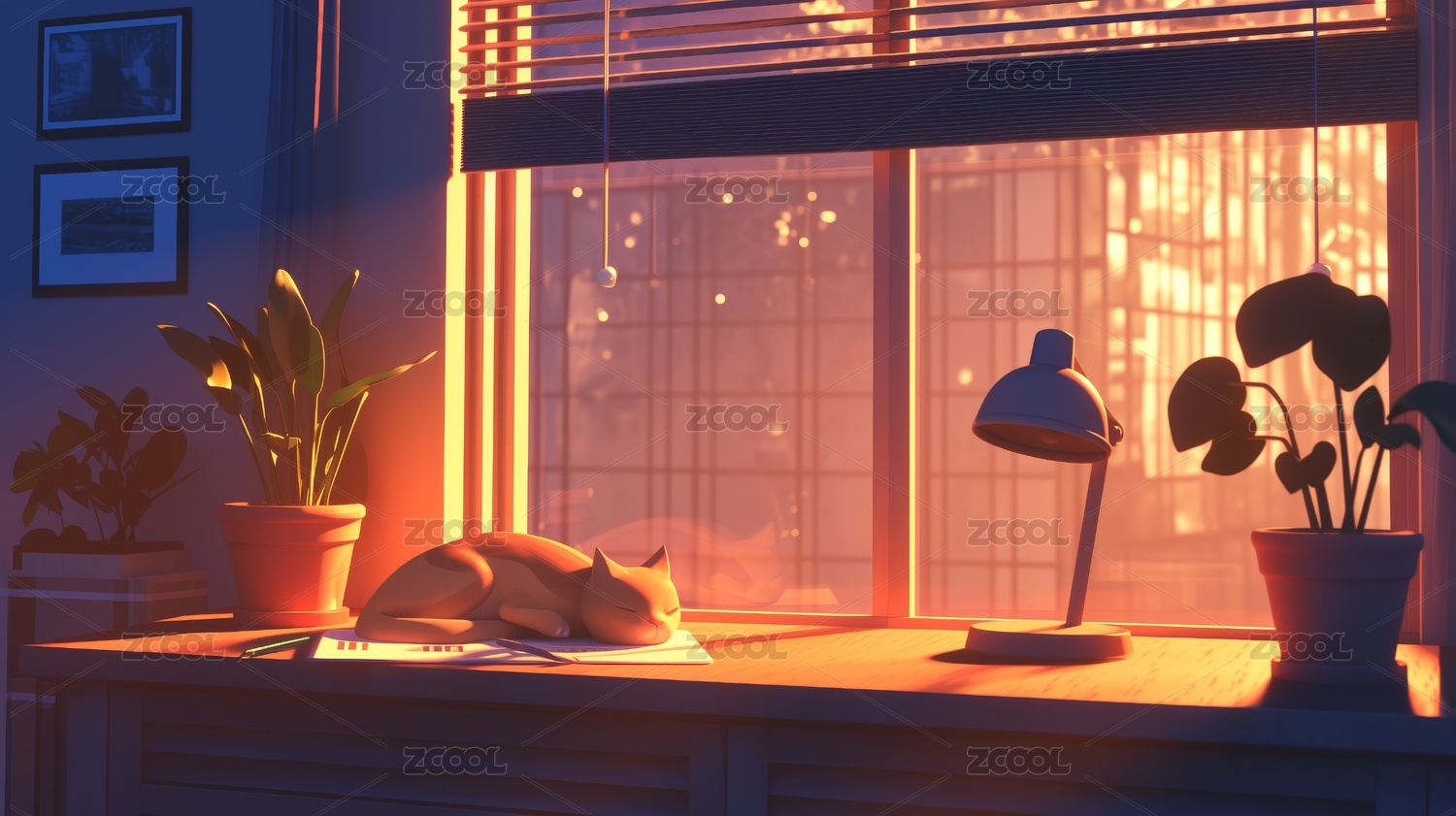 夜晚窗边亮光下睡觉的小猫3D卡通立体插画
