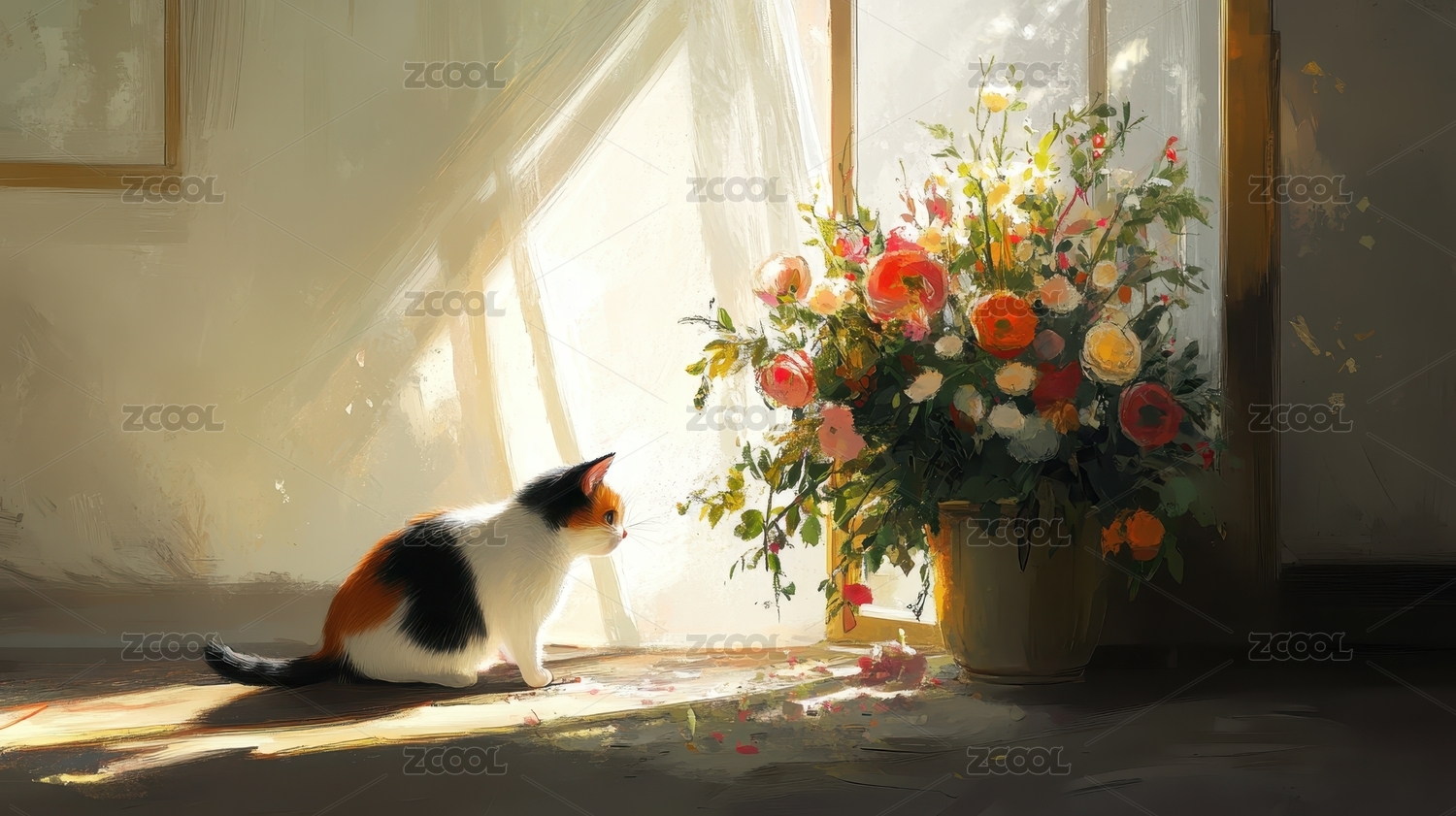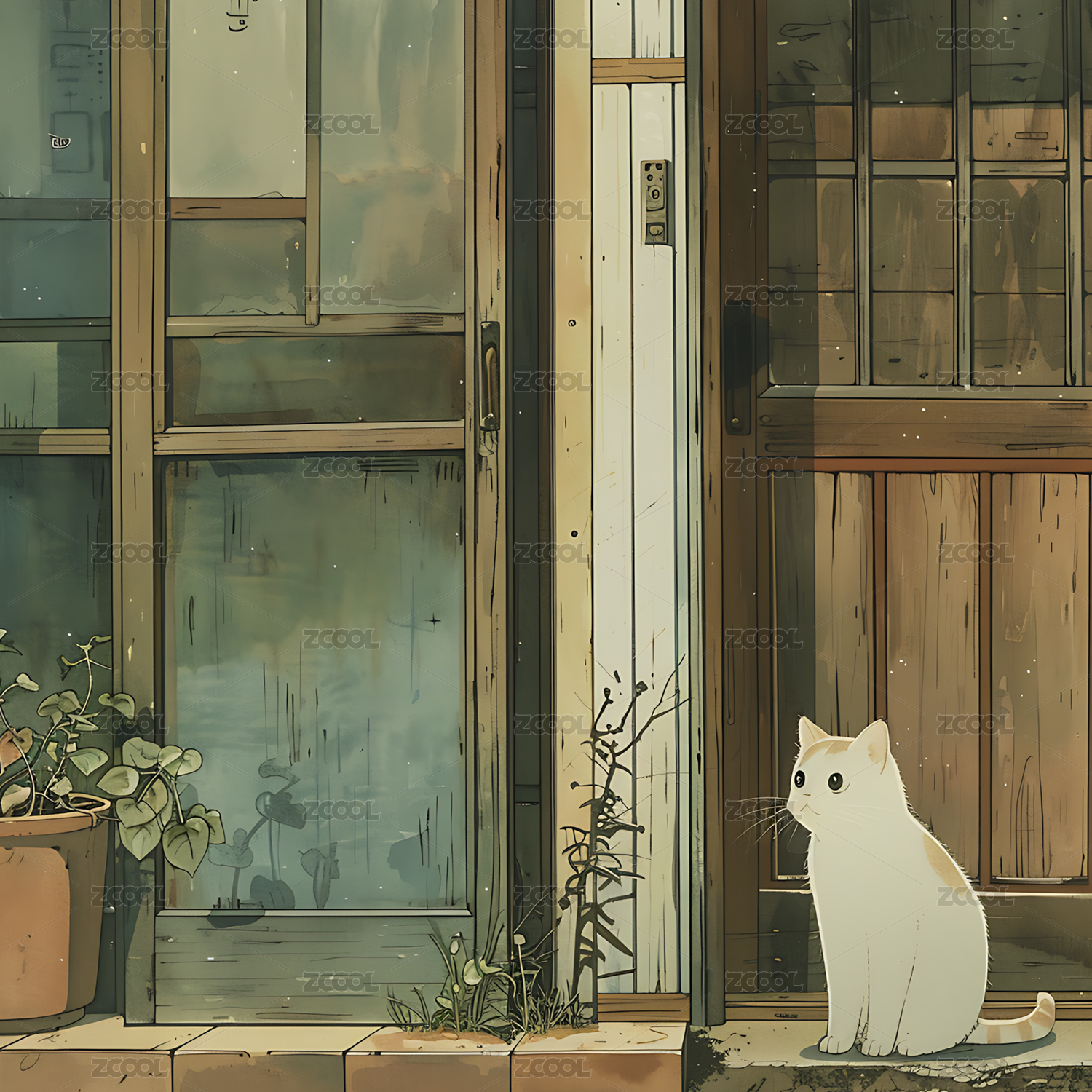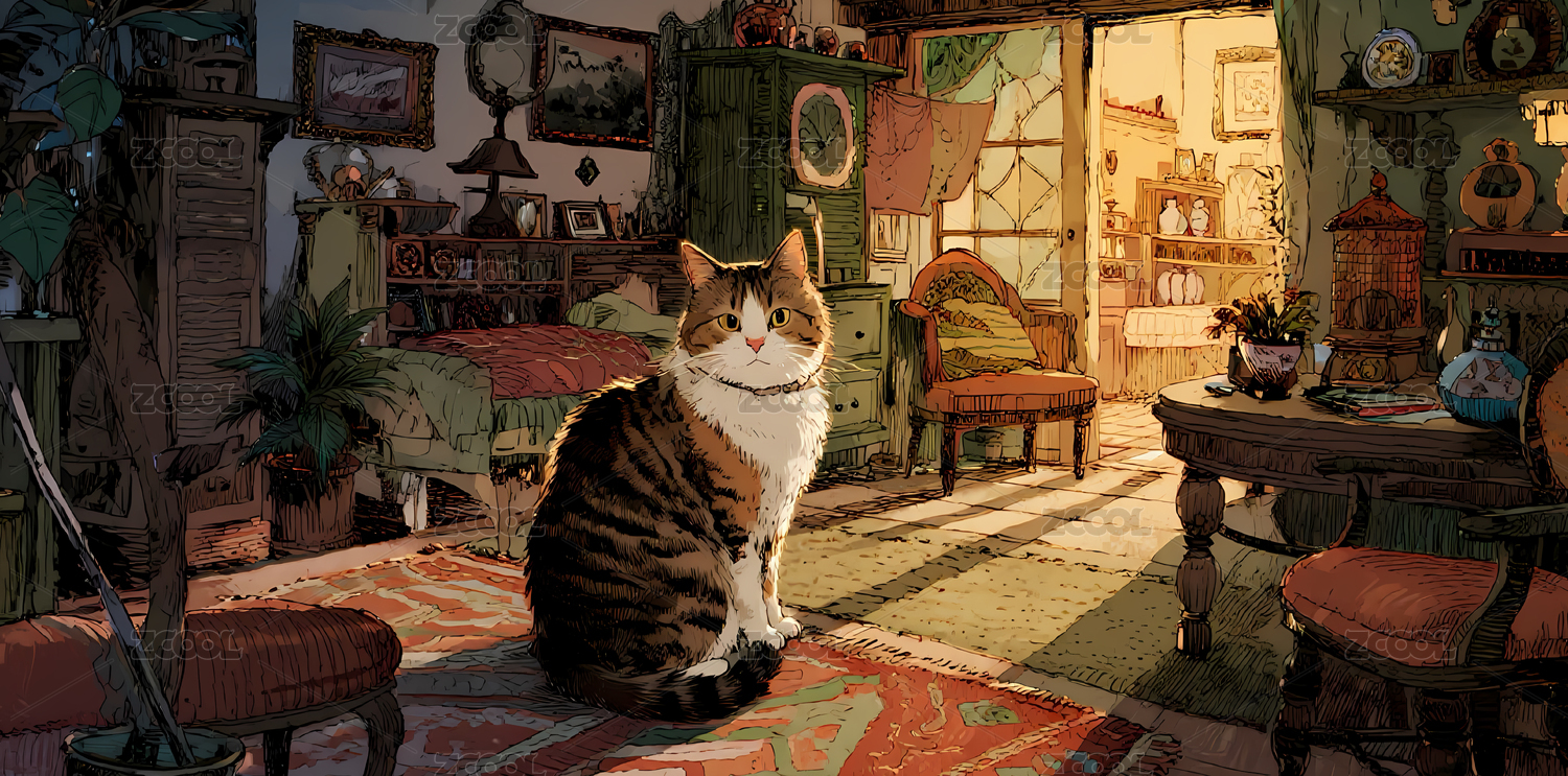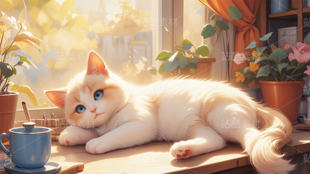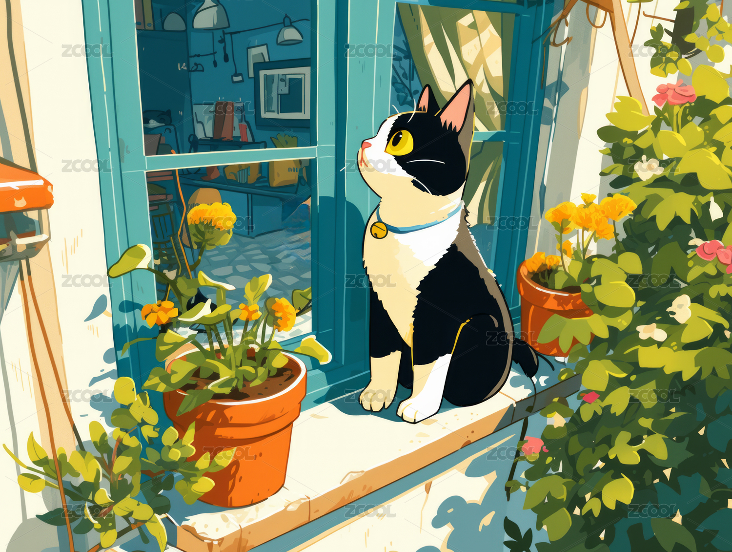 夜晚窗边亮光下睡觉的小猫3D卡通立体插画