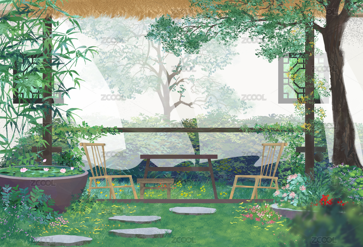 夏季种满植物的凉亭