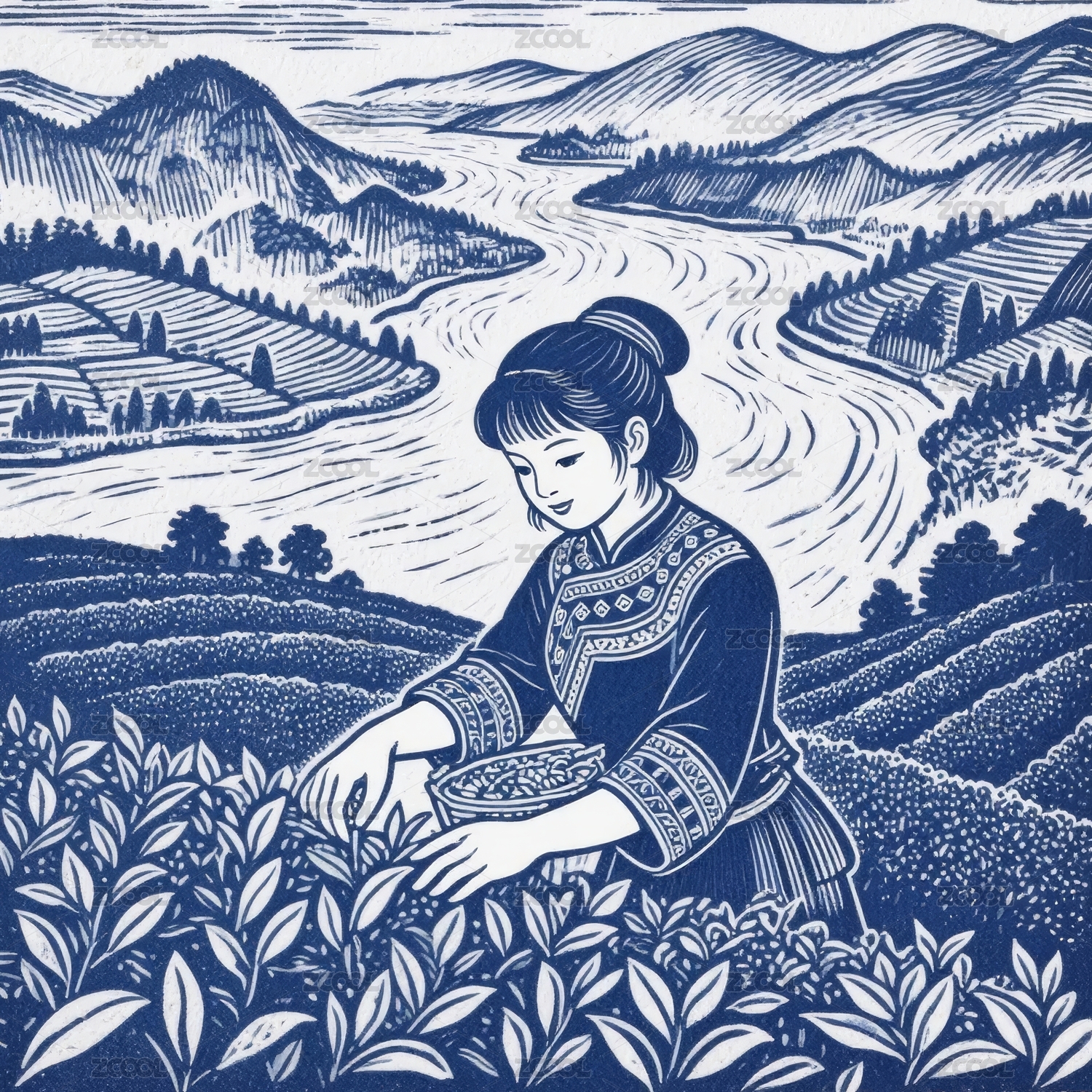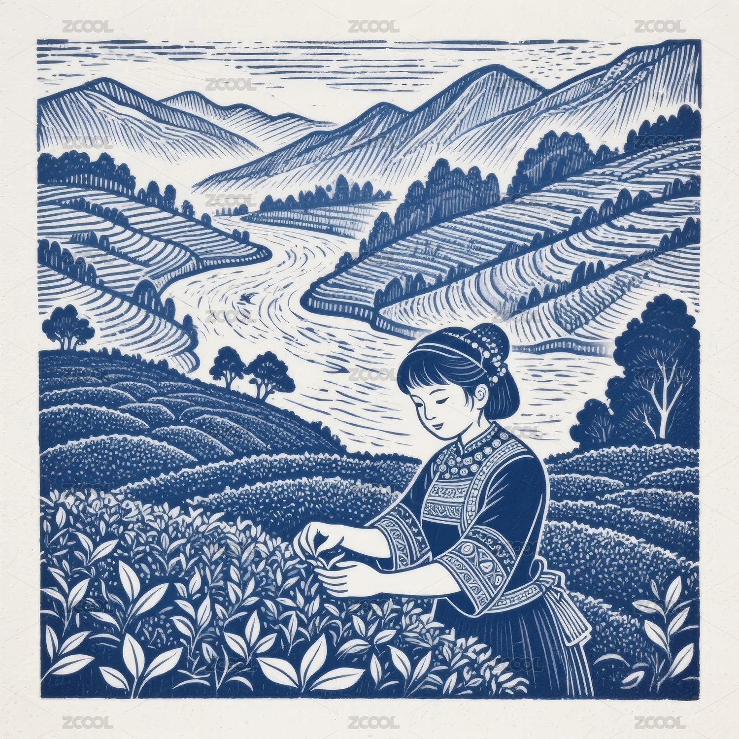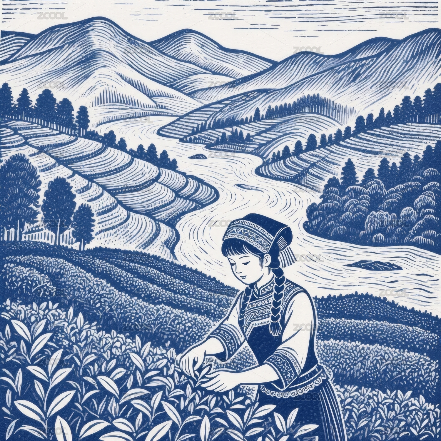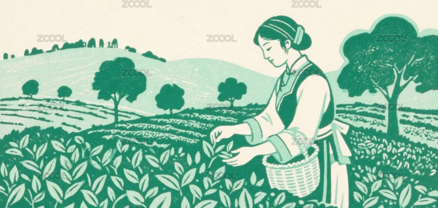 采茶女版画风田园场景