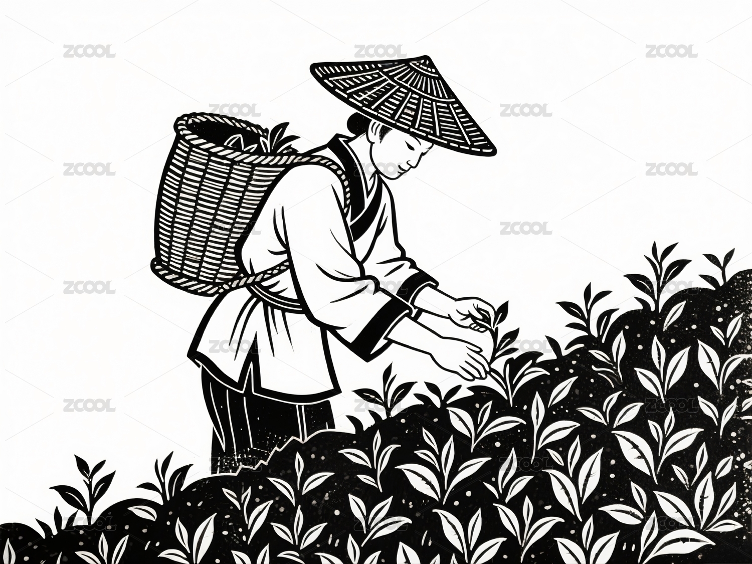 一位采茶女孩的黑白复古线条插画