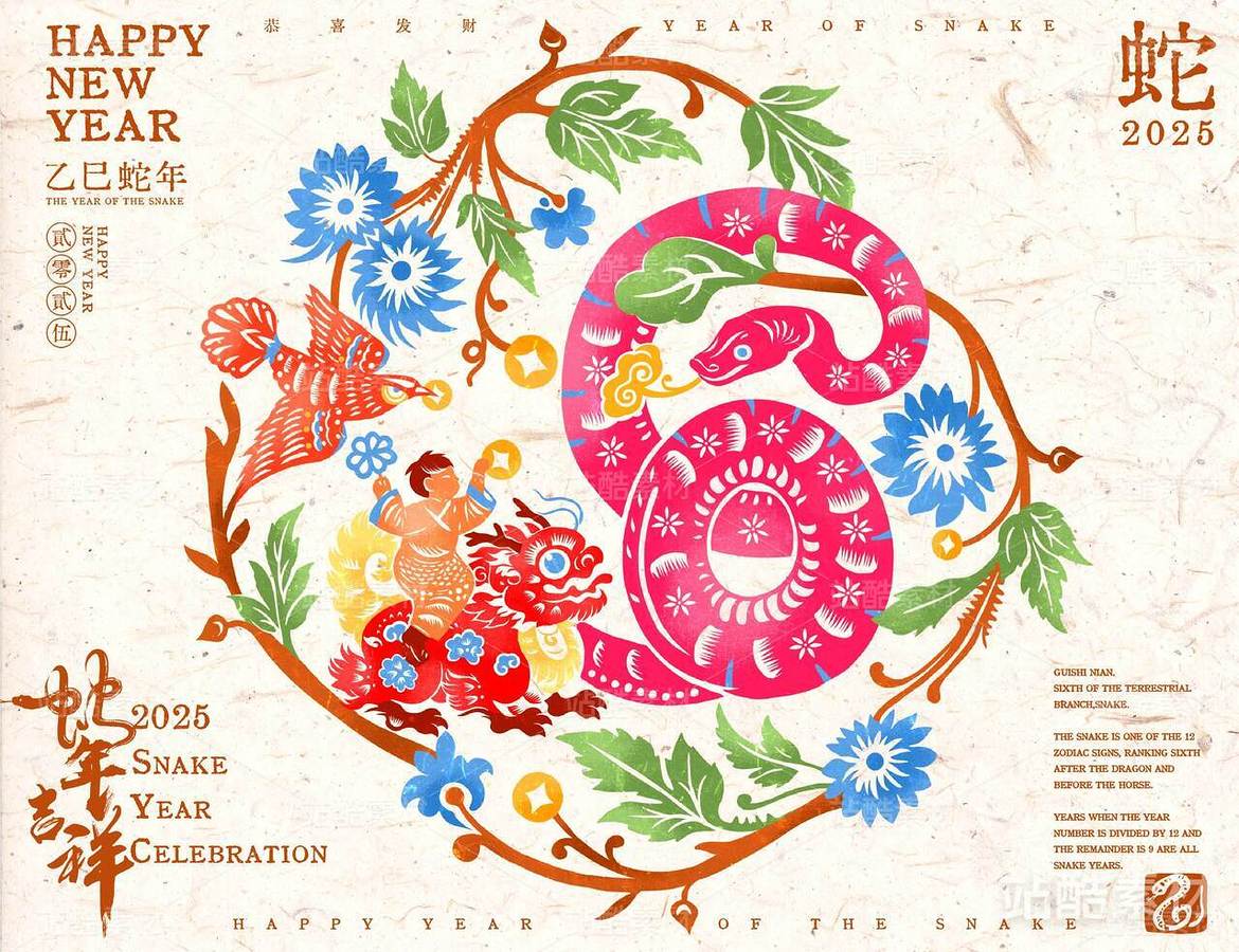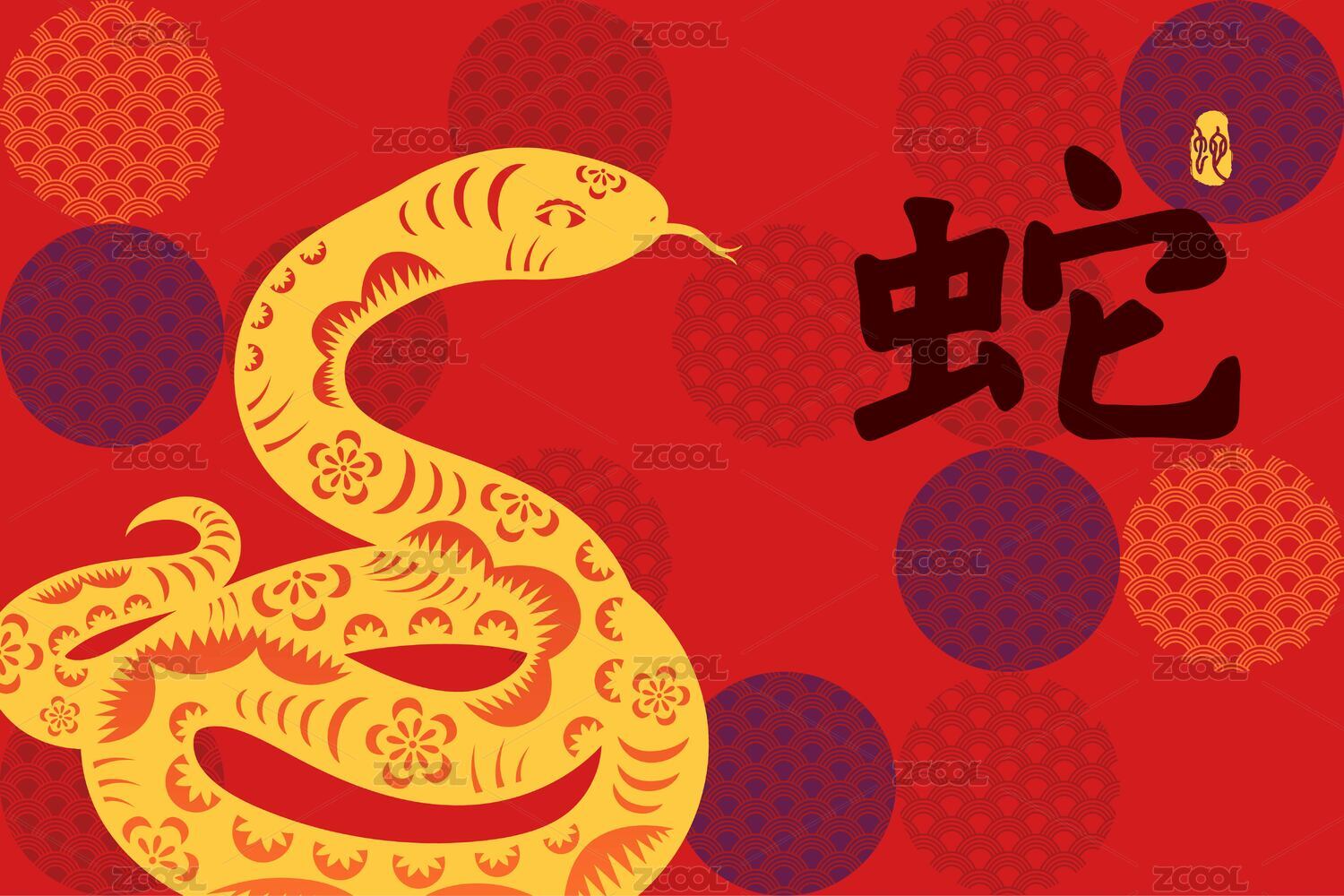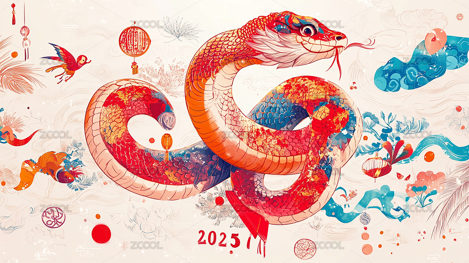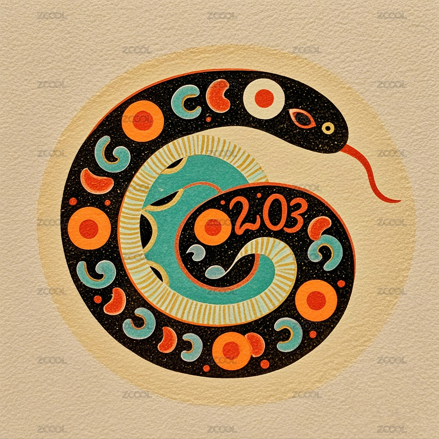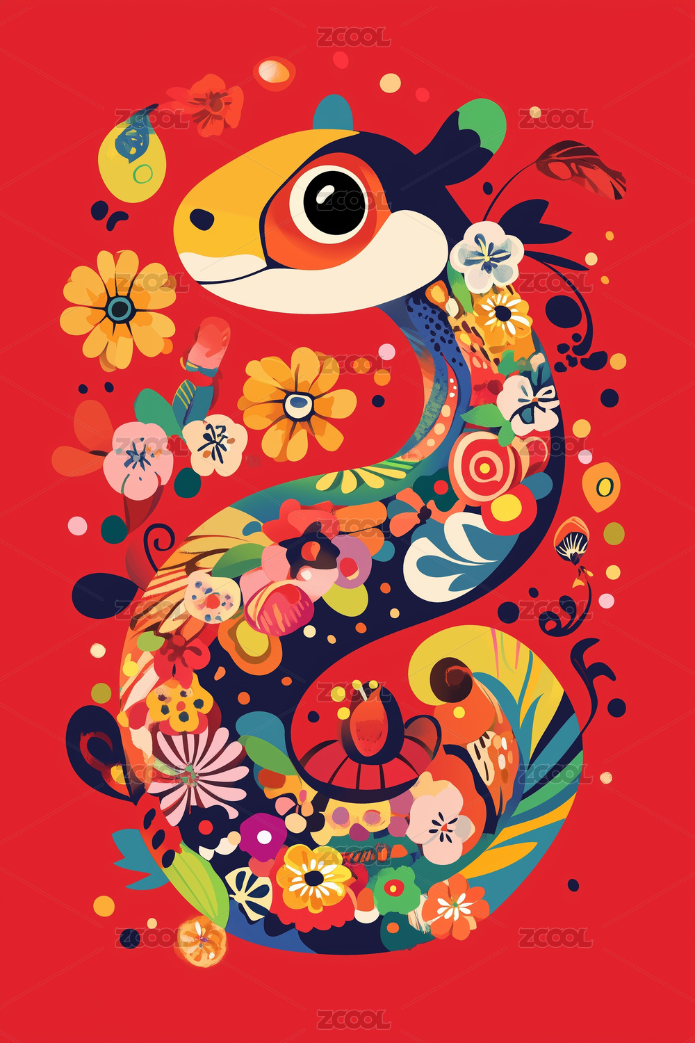 喜庆的复古风格五彩斑斓的蛇和花朵