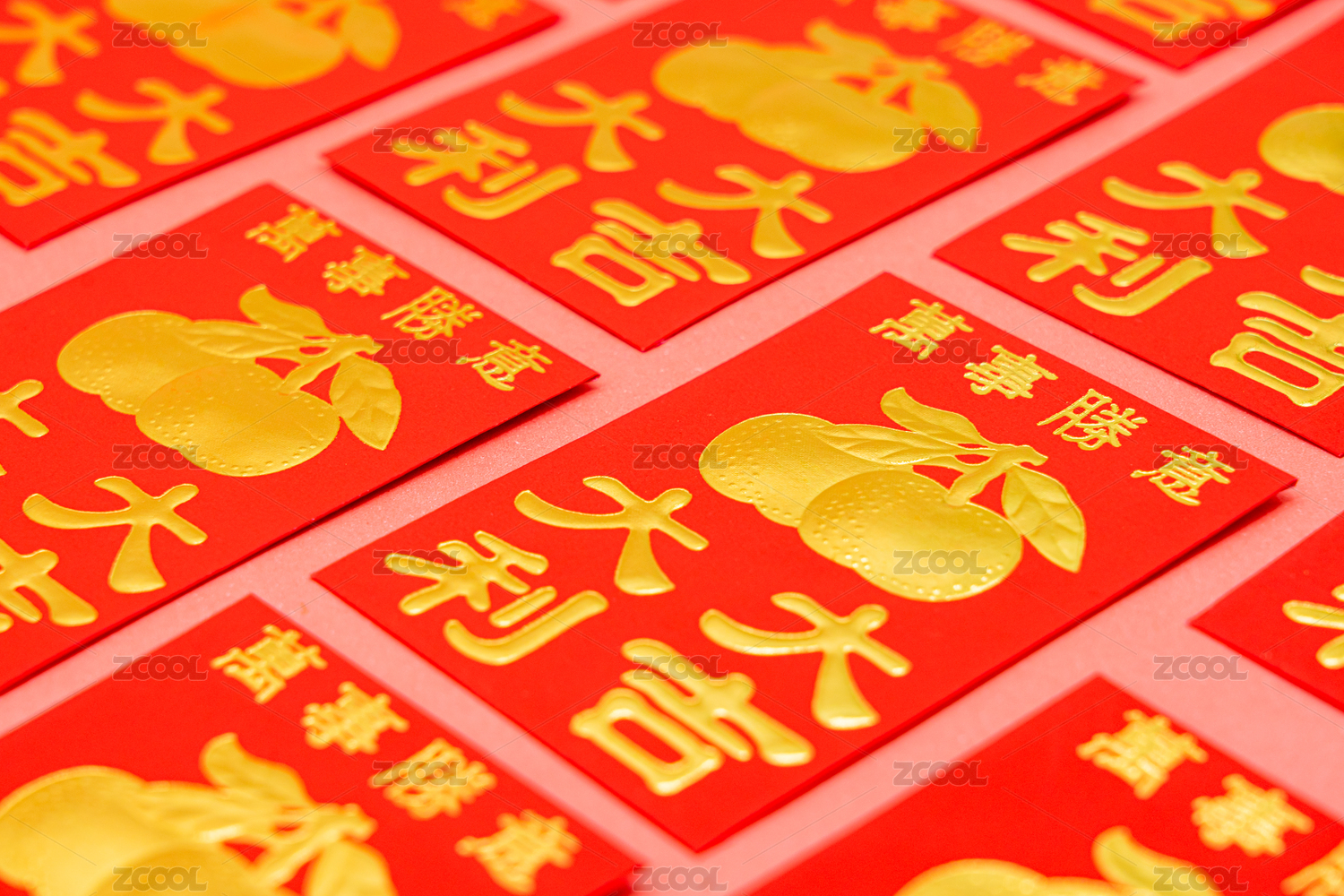 红色背景中排列整齐的春节新年红包